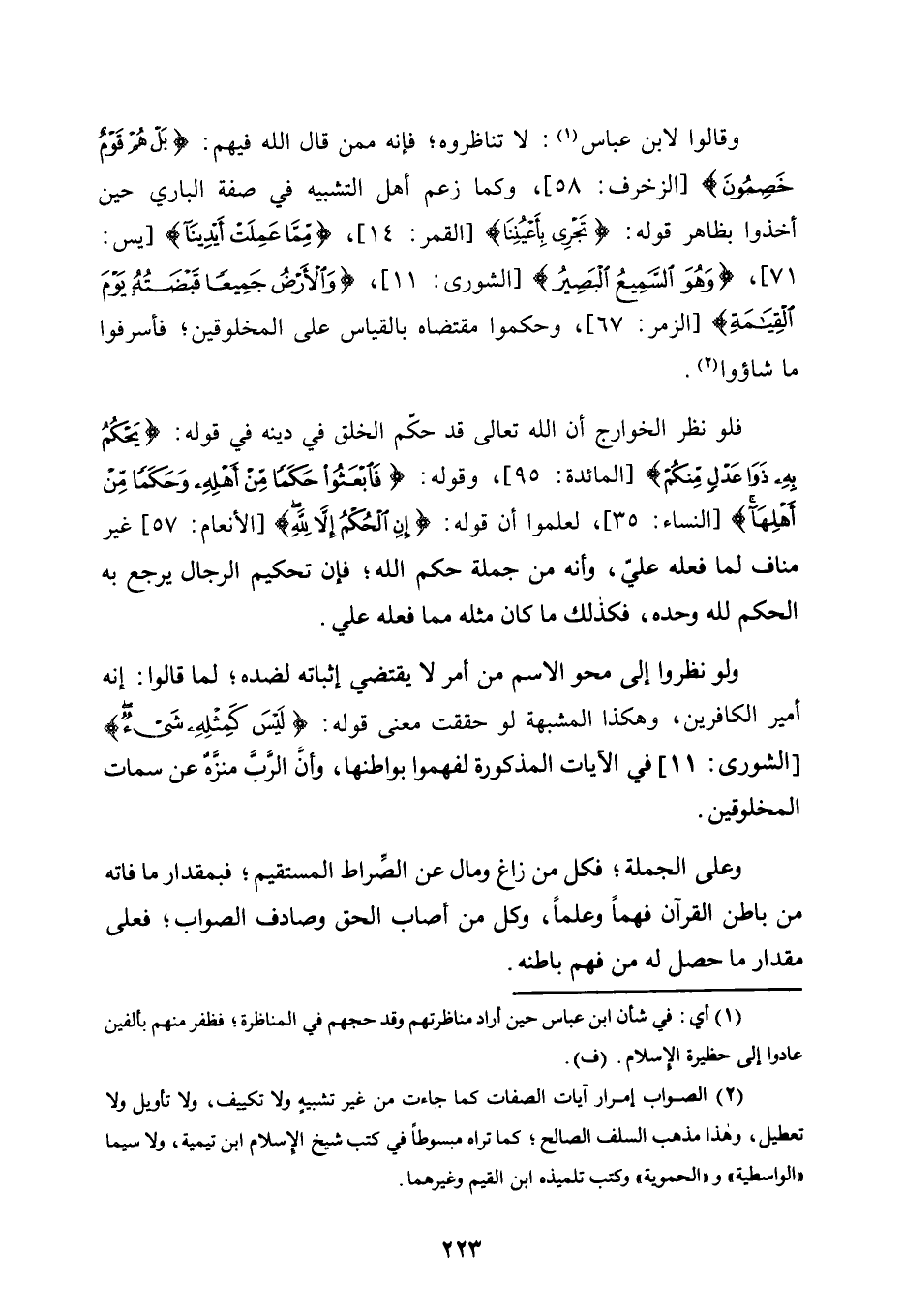 فَلَوْ نَظَرَ الْخَوَارِجُ أَنَّ اللَّهَ تَعَالَى قَدْ حَكَّمَ الْخَلْقَ فِي دِينِهِ فِي قَوْلِهِ: {يَحْكُمُ بِهِ ذَوَا عَدْلٍ مِنْكُمْ} [الْمَائِدَةِ: 95] ، وَقَوْلِهِ {فَابْعَثُوا حَكَمًا مِنْ أَهْلِهِ وَحَكَمًا مِنْ أَهْلِهَا} [النِّسَاءِ: 35] ، لَعَلِمُوا أَنَّ قَوْلَهُ: {إِنِ الْحُكْمُ إِلَّا لِلَّهِ} [الْأَنْعَامِ: 57] غَيْرُ مُنَافٍ لِمَا فَعَلَهُ عَلِيٌّ، وَأَنَّهُ مِنْ جُمْلَةِ حُكْمِ اللَّهِ؛ فَإِنَّ تَحْكِيمَ الرِّجَالِ يَرْجِعُ بِهِ الْحُكْمُ لِلَّهِ وَحْدَهُ، فَكَذَلِكَ مَا كَانَ مِثْلُهُ مِمَّا فَعَلَهُ عَلِيٌّ.