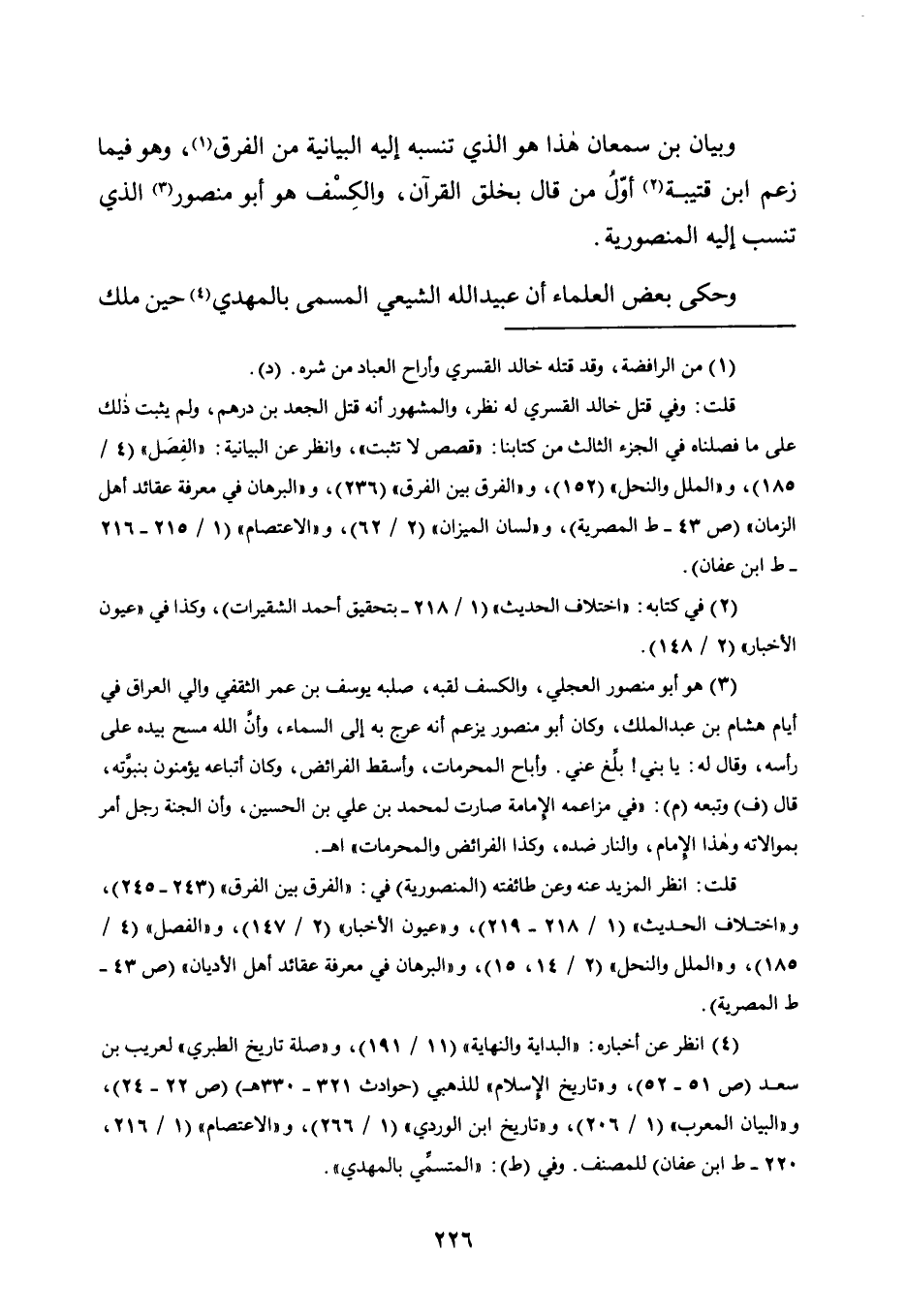 قلت: وفي قتل خالد القسري له نظر، والمشهور أنه قتل الجعد بن درهم، ولم يثبت ذلك على ما فصلناه في الجزء الثالث من كتابنا: "قصص لا تثبت"، وانظر عن البيانية: "الفصل" "4/ 185"، و"الملل والنحل" "152"، و"الفرق بين الفرق" "236"، و"البرهان في معرفة عقائد أهل الزمان" "ص43, ط المصرية"، و"لسان الميزان" "2/ 62"، و"الاعتصام" "1/ 215-216, ط ابن عفان".