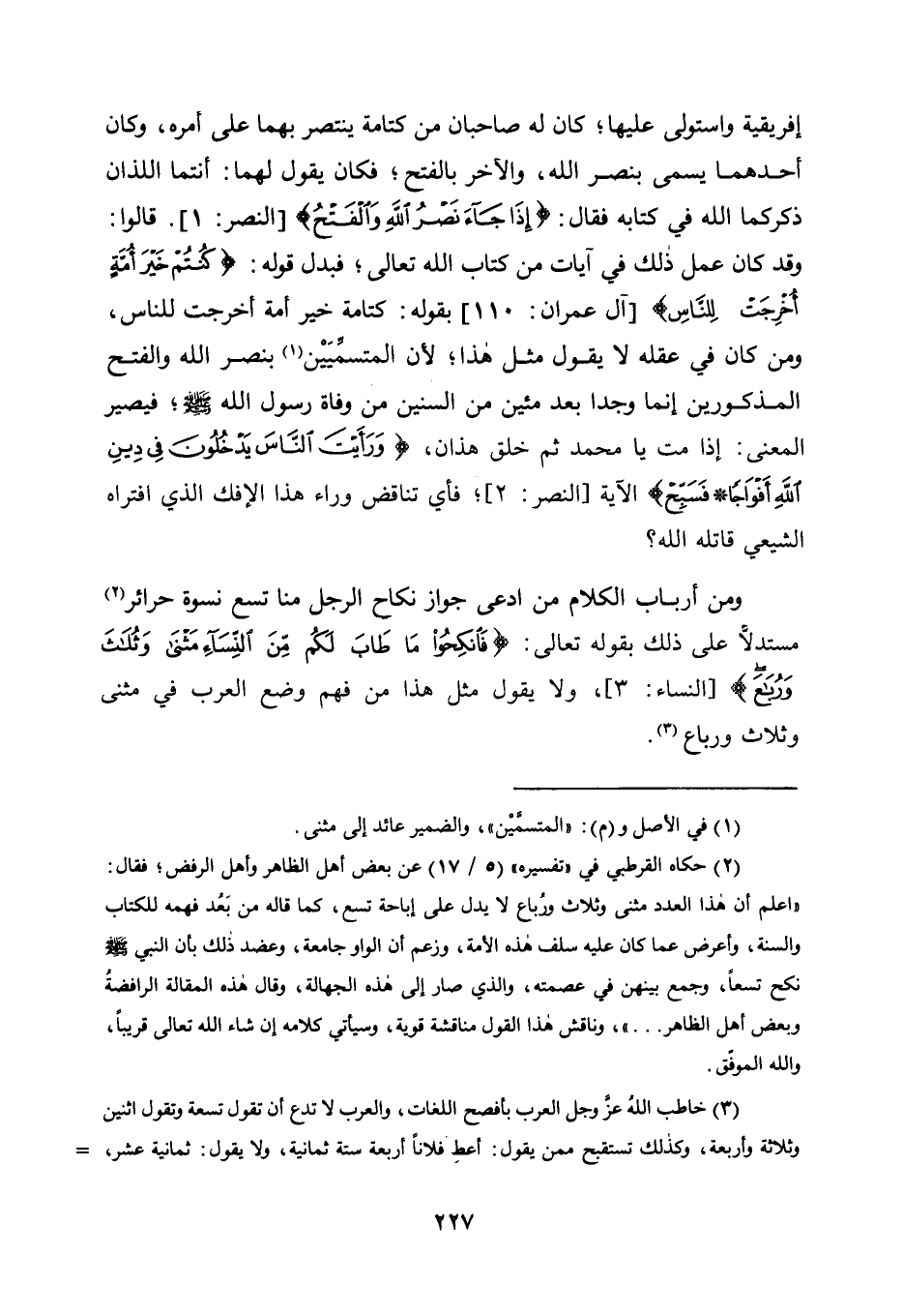 وَمِنْ أَرْبَابِ الْكَلَامِ مَنِ ادَّعَى جَوَازَ نِكَاحِ الرَّجُلِ مِنَّا تِسْعَ نِسْوَةٍ حَرَائِرَ2 مُسْتَدِلًّا عَلَى ذَلِكَ بِقَوْلِهِ تَعَالَى: {فَانْكِحُوا مَا طَابَ لَكُمْ مِنَ النِّسَاءِ مَثْنَى وَثُلاثَ وَرُبَاعَ} [النِّسَاءِ: 3] ، وَلَا يَقُولُ مِثْلَ هَذَا مَنْ فَهِمَ وَضْعَ الْعَرَبِ فِي مثنى وثلاث ورباع3.