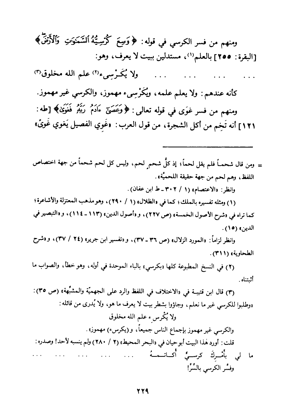 3 قال ابن قتيبة في "الاختلاف في اللفظ والرد على الجهمية والمشبهة" "ص35": "وطلبوا للكرسي غير ما نعلم، وجاءوا بشطر بيت لا يعرف ما هو، ولا يدرى من قائله:
