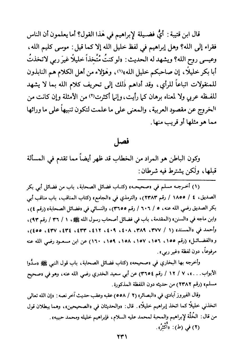 قَالَ ابْنُ قُتَيْبَةَ: أَيُّ فَضِيلَةٍ لِإِبْرَاهِيمَ فِي هَذَا الْقَوْلِ؟ أَمَا يَعْلَمُونَ أَنَّ النَّاسَ فُقَرَاءُ إِلَى اللَّهِ؟ وَهَلْ إِبْرَاهِيمُ فِي لَفْظِ خَلِيلِ اللَّهِ إِلَّا كَمَا قِيلَ: مُوسَى كَلِيمُ اللَّهِ، وَعِيسَى رُوحُ اللَّهِ؟ وَيَشْهَدُ لَهُ الْحَدِيثُ: "لَوْ كُنْتُ مُتَّخِذًا خَلِيلًا غَيْرَ رَبِّي لَاتَّخَذْتُ أَبَا بَكْرٍ خَلِيلًا، إِنَّ صَاحِبَكُمْ خَلِيلُ اللَّهِ" 1، وَهَؤُلَاءِ مِنْ أَهْلِ الْكَلَامِ هُمُ النَّابِذُونَ لِلْمَنْقُولَاتِ اتِّبَاعًا لِلرَّأْيِ، وَقَدْ أَدَّاهُمْ ذَلِكَ إِلَى تَحْرِيفِ كَلَامِ اللَّهِ بِمَا لَا يَشْهَدُ لِلَفْظِهِ عَرَبِيٌّ وَلَا لِمَعْنَاهُ بِرِهَانٌ كَمَا رَأَيْتَ، وَإِنَّمَا أَكْثَرْتُ2 مِنَ الْأَمْثِلَةِ وَإِنْ كَانَتْ مِنَ الْخُرُوجِ عَنْ مَقْصُودِ الْعَرَبِيَّةِ، وَالْمَعْنَى عَلَى مَا عَلِمْتَ لِتَكُونَ تَنْبِيهًا عَلَى مَا وَرَاءَهَا مِمَّا هُوَ مِثْلُهَا أَوْ قَرِيبٌ مِنْهَا.
