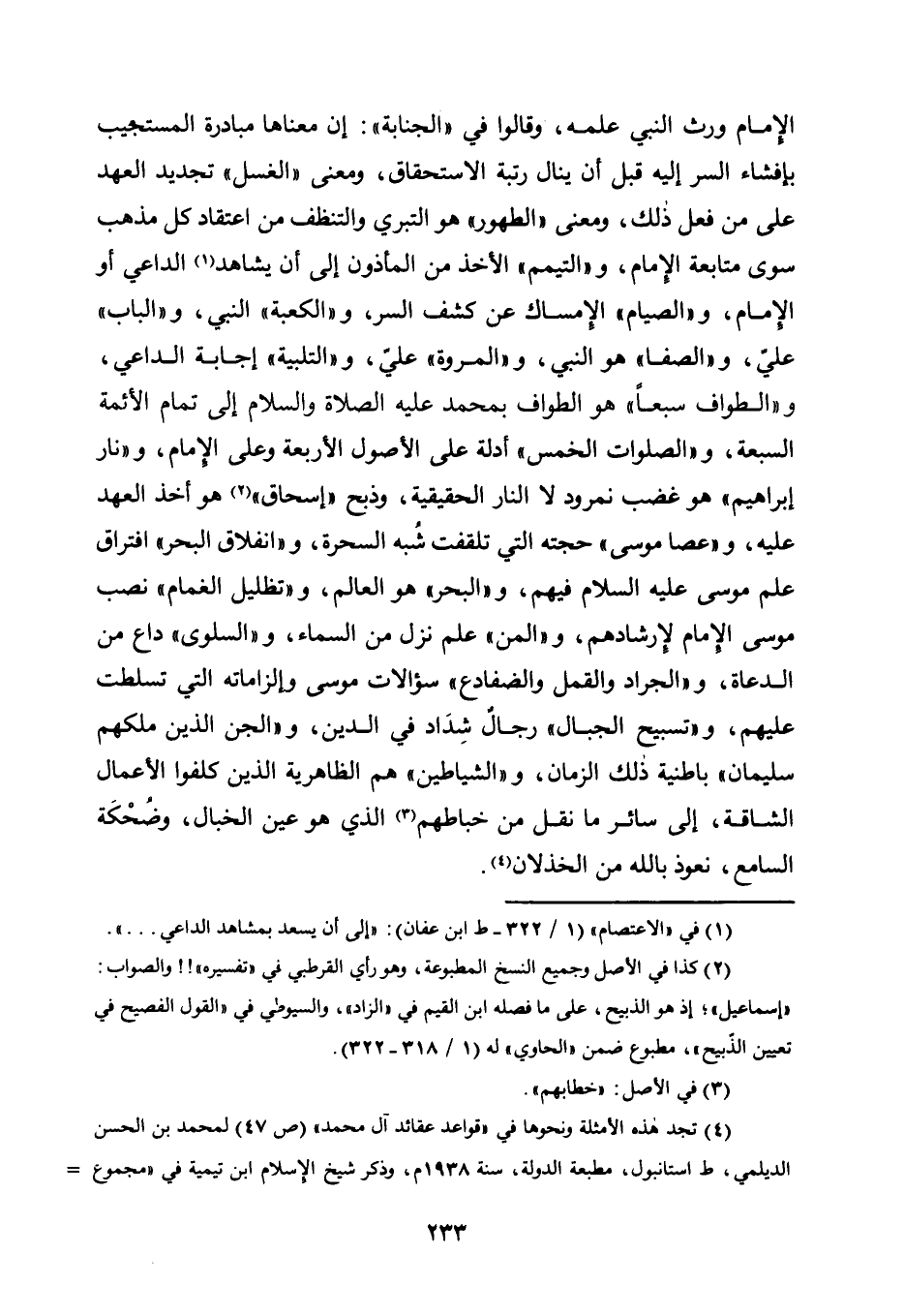 الْإِمَامُ وَرِثَ النَّبِيَّ عِلْمَهُ، وَقَالُوا فِي "الْجَنَابَةِ": إِنَّ مَعْنَاهَا مُبَادَرَةُ الْمُسْتَجِيبِ بِإِفْشَاءِ السِّرِّ إِلَيْهِ قَبْلَ أَنْ يَنَالَ رُتْبَةَ الِاسْتِحْقَاقِ، وَمَعْنَى "الْغُسْلِ" تَجْدِيدُ الْعَهْدِ عَلَى مَنْ فَعَلَ ذَلِكَ، وَمَعْنَى "الطَّهُورِ" هُوَ التَّبَرِّي وَالتَّنَظُّفُ مِنِ اعْتِقَادِ كُلِّ مذهب سوى متابعة الإمام، و"التيمم" الْأَخْذُ مِنَ الْمَأْذُونِ إِلَى أَنْ يُشَاهَدَ1 الدَّاعِي أو الإمام، و"الصيام" الإمساك عن كشف السر، و"الكعبة" النبي، و"الباب" عليّ، و"الصفا" هو النبي، و"المروة" عليّ، و"التلبية" إجابة الداعي، و"الطواف سَبْعًا" هُوَ الطَّوَافُ بِمُحَمَّدٍ -عَلَيْهِ الصَّلَاةُ وَالسَّلَامُ- إلى تمام الأئمة السبعة، و"الصلوات الْخَمْسُ" أَدِلَّةٌ عَلَى الْأُصُولِ الْأَرْبَعَةِ وَعَلَى الْإِمَامِ، و"نار إِبْرَاهِيمَ" هُوَ غَضَبُ نَمْرُودَ لَا النَّارُ الْحَقِيقِيَّةُ، وذبح "إسحاق"2 هو أخذ العهد عليه، و"عصا موسى" حجته التي تلقفت شبه السحرة، و"انفلاق الْبَحْرِ" افْتِرَاقُ عِلْمِ مُوسَى -عَلَيْهِ السَّلَامُ- فِيهِمْ، و"البحر" هو العالم، و"تظليل الغمام" نصب موسى الإمام لإرشادهم، و"المن" علم نزل من السماء، و"السلوى" داع من الدعاة، و"الجراد وَالْقُمَّلُ وَالضَّفَادِعُ" سُؤَالَاتُ مُوسَى وَإِلْزَمَاتُهُ الَّتِي تَسَلَّطَتْ عليهم، و"تسبيح الجبال" رجال شداد في الدين، و"الجن الذين ملكهم سليمان" باطنية ذلك الزمان، و"الشياطين" هُمُ الظَّاهِرِيَّةُ الَّذِينَ كُلِّفُوا الْأَعْمَالَ الشَّاقَّةَ، إِلَى سَائِرِ مَا نُقِلَ مِنْ خُبَاطِهِمُ3 الَّذِي هُوَ عَيْنُ الْخَبَالِ، وَضِحْكَةُ السَّامِعِ، نَعُوذُ بِاللَّهِ مِنِ الخذلان4.