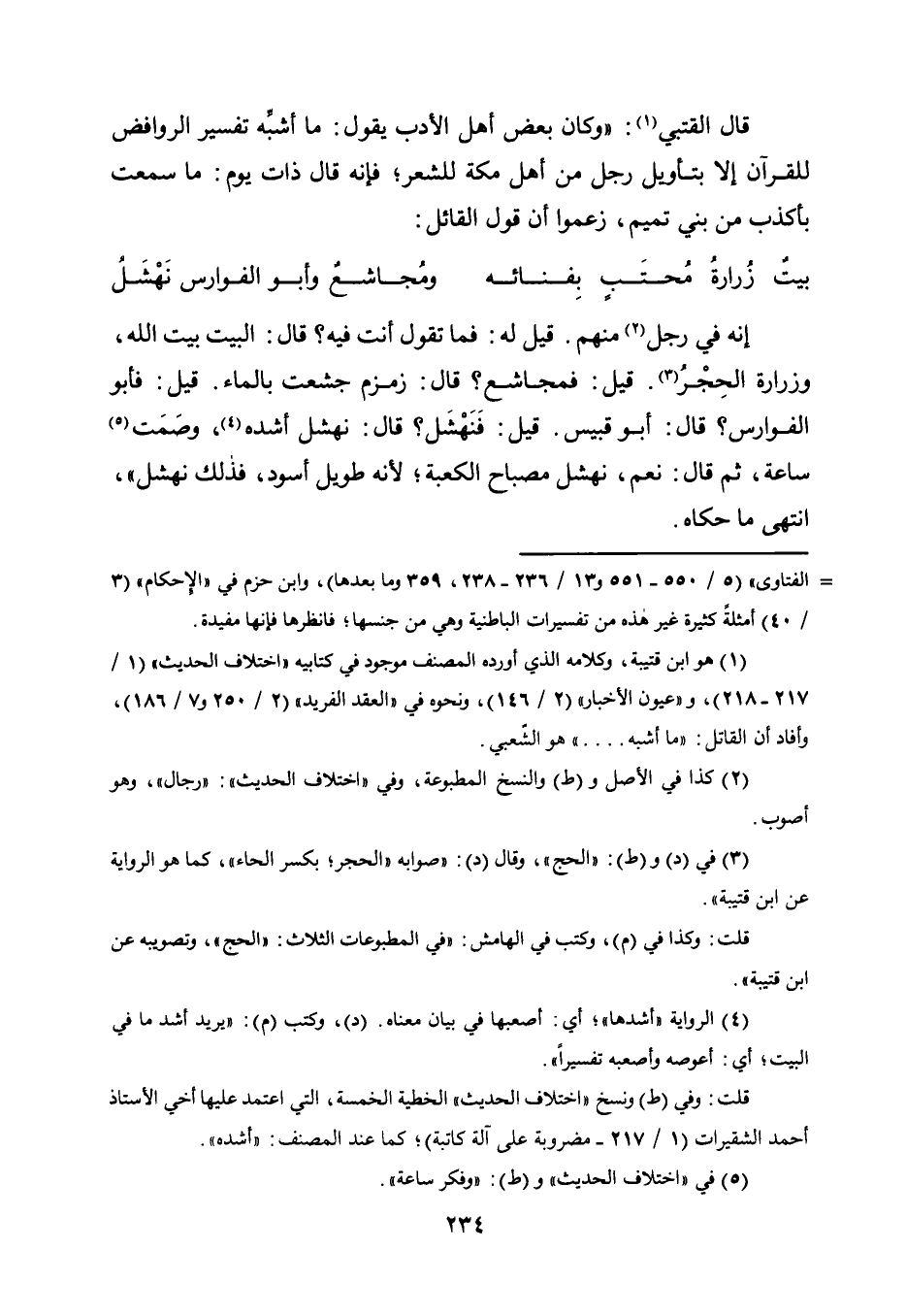 قَالَ الْقُتْبِيُّ1: "وَكَانَ بَعْضُ أَهْلِ الْأَدَبِ يَقُولُ: مَا أُشَبِّهُ تَفْسِيرَ الرَّوَافِضِ لِلْقُرْآنِ إِلَّا بِتَأْوِيلِ رَجُلٍ مِنْ أَهْلِ مَكَّةَ لِلشِّعْرِ؛ فَإِنَّهُ قَالَ ذَاتَ يَوْمٍ: مَا سَمِعْتُ بِأَكْذَبَ مِنْ بَنِي تَمِيمٍ، زَعَمُوا أَنَّ قَوْلَ الْقَائِلِ: