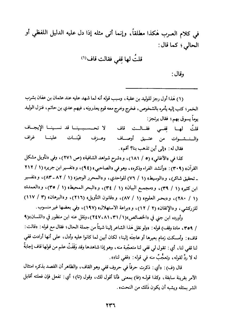 فِي كَلَامِ الْعَرَبِ هَكَذَا مُطْلَقًا، وَإِنَّمَا أَتَى مِثْلُهُ إِذَا دَلَّ عَلَيْهِ الدَّلِيلُ اللَّفْظِيُّ أَوِ الْحَالِيُّ؛ كَمَا قَالَ: