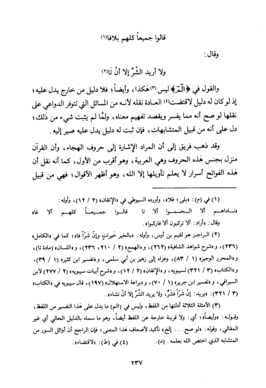 3 الأمثلة الثلاثة أدلتها من اللفظ، وليس في "الم" ما يدل على هذا التفسير من اللفظ، وقوله: "وأيضًا"؛ أي: ولا قرينة خارجة عن اللفظ أيضًا، وهو ما سماه بالدليل الحالي أي: غير المقالي، وقوله: "لو صح ... إلخ" تأكيد لأضعاف هذا المعنى؛ فإن الراجح أن أوائل السور من المتشابه الذي اختص الله بعلمه. "د".