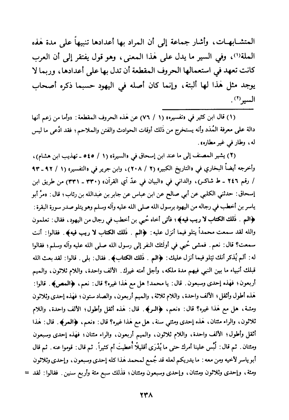 الْمُتَشَابِهَاتِ، وَأَشَارَ جَمَاعَةٌ إِلَى أَنَّ الْمُرَادَ بِهَا أَعْدَادُهَا تَنْبِيهًا عَلَى مُدَّةِ هَذِهِ الْمِلَّةِ1، وَفِي السِّيَرِ مَا يَدُلُّ عَلَى هَذَا الْمَعْنَى، وَهُوَ قَوْلٌ يَفْتَقِرُ إِلَى أَنَّ الْعَرَبَ كَانَتْ تَعْهَدُ فِي اسْتِعْمَالِهَا الْحُرُوفَ الْمُقَطَّعَةَ أَنْ تَدُلَّ بِهَا عَلَى أَعْدَادِهَا، وَرُبَّمَا لَا يُوجَدُ مِثْلُ هَذَا لَهَا أَلْبَتَّةَ، وَإِنَّمَا كَانَ أَصْلُهُ فِي الْيَهُودِ حسبما ذكره أصحاب السير2.
