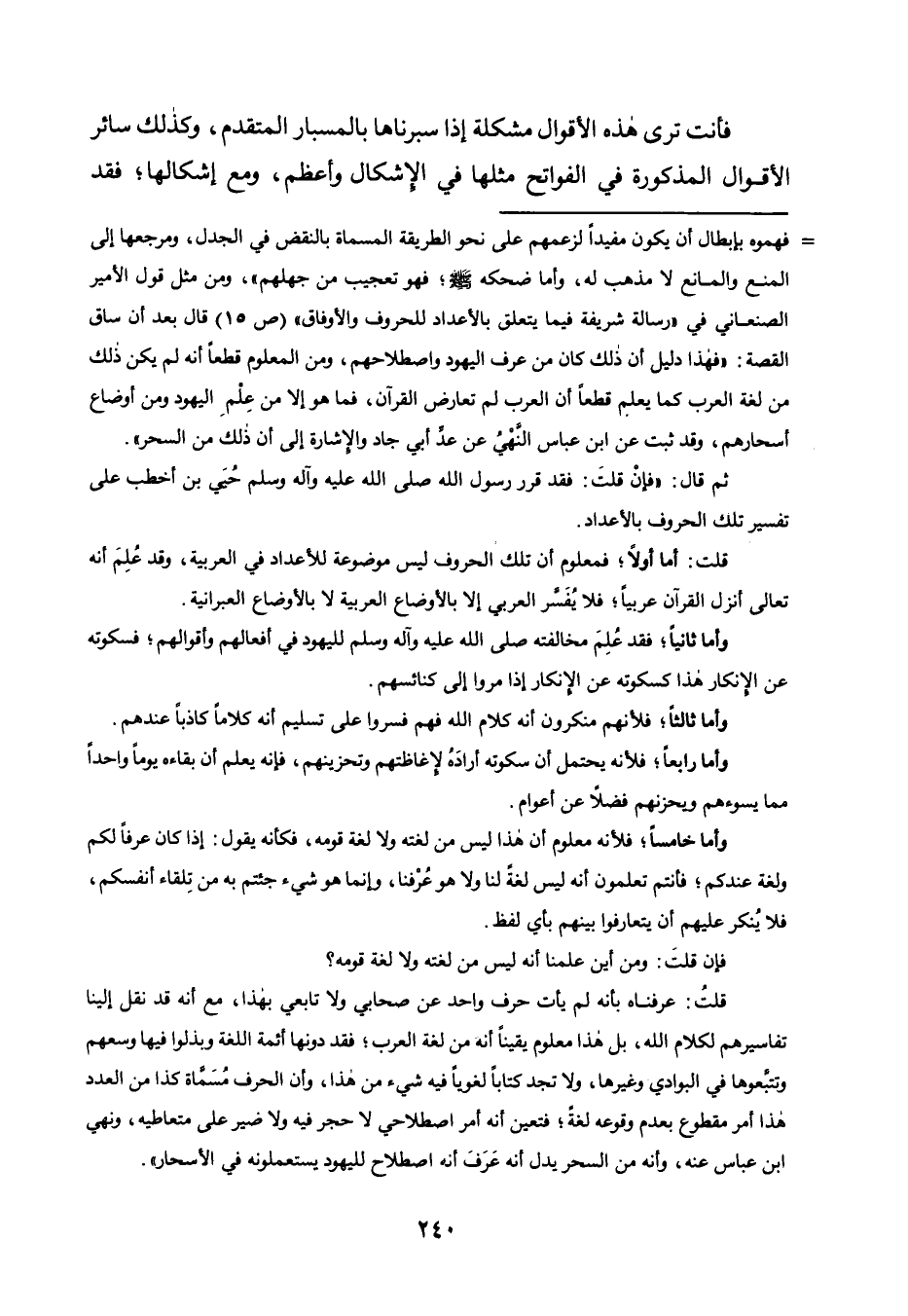 = فهموه بإبطال أن يكون مفيدًا لزعمهم على نحو الطريقة المسماة بالنقض في الجدل، ومرجعها إلى المنع والمانع لا مذهب له، وأما ضحكه -صلى الله عليه وسلم- فهو تعجيب من جهلهم"، ومن مثل قول الأمير الصنعاني في "رسالة شريفة فيما يتعلق بالأعداد للحروف والأوفاق" "ص15" قال بعد أن ساق القصة: "فهذا دليل أن ذلك كان من عرف اليهود واصطلاحهم، ومن المعلوم قطعًا أنه لم يكن ذلك من لغة العرب كما يعلم قطعًا أن العرب لم تعارض القرآن، فما هو إلا من علم اليهود ومن أوضاع أسحارهم، وقد ثبت عن ابن عباس النهي عن عد أبي جاد والإشارة إلى أن ذلك من السحر".