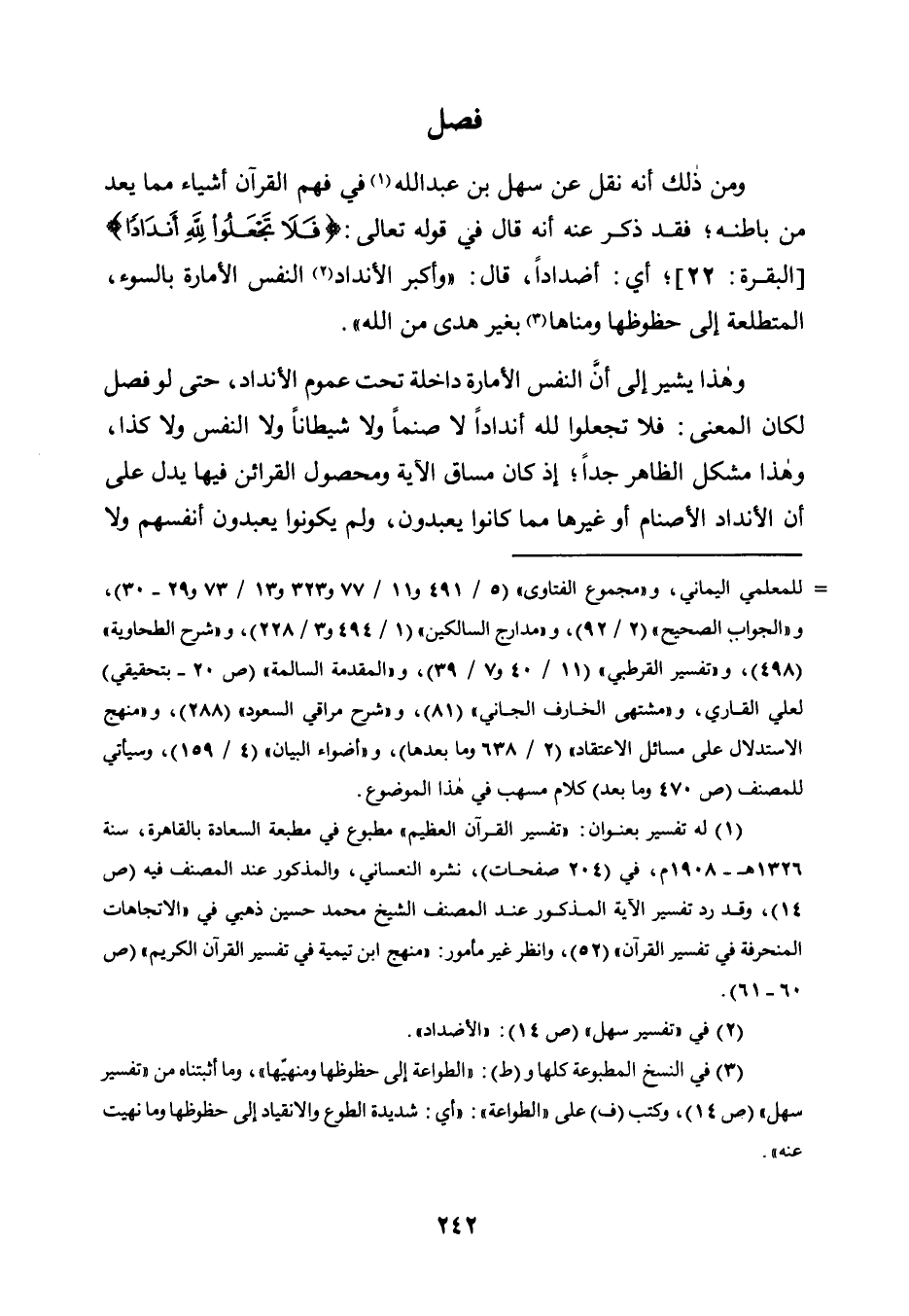 وَمِنْ ذَلِكَ أَنَّهُ نُقِلَ عَنْ سَهْلِ بْنِ عَبْدِ اللَّهِ1 فِي فَهْمِ الْقُرْآنِ أَشْيَاءُ مِمَّا يُعَدُّ مِنْ بَاطِنِهِ؛ فَقَدْ ذُكِرَ عَنْهُ أَنَّهُ قَالَ فِي قَوْلِهِ تَعَالَى: {فَلا تَجْعَلُوا لِلَّهِ أَنْدَادًا} [الْبَقَرَةِ: 22] ؛ أَيْ: أَضْدَادًا، قَالَ: "وَأَكْبَرُ الأنداد2 النفس الأمارة بالسوء، المتطلعة إِلَى حُظُوظِهَا وَمُنَاهَا3 بِغَيْرِ هُدًى مِنَ اللَّهِ".