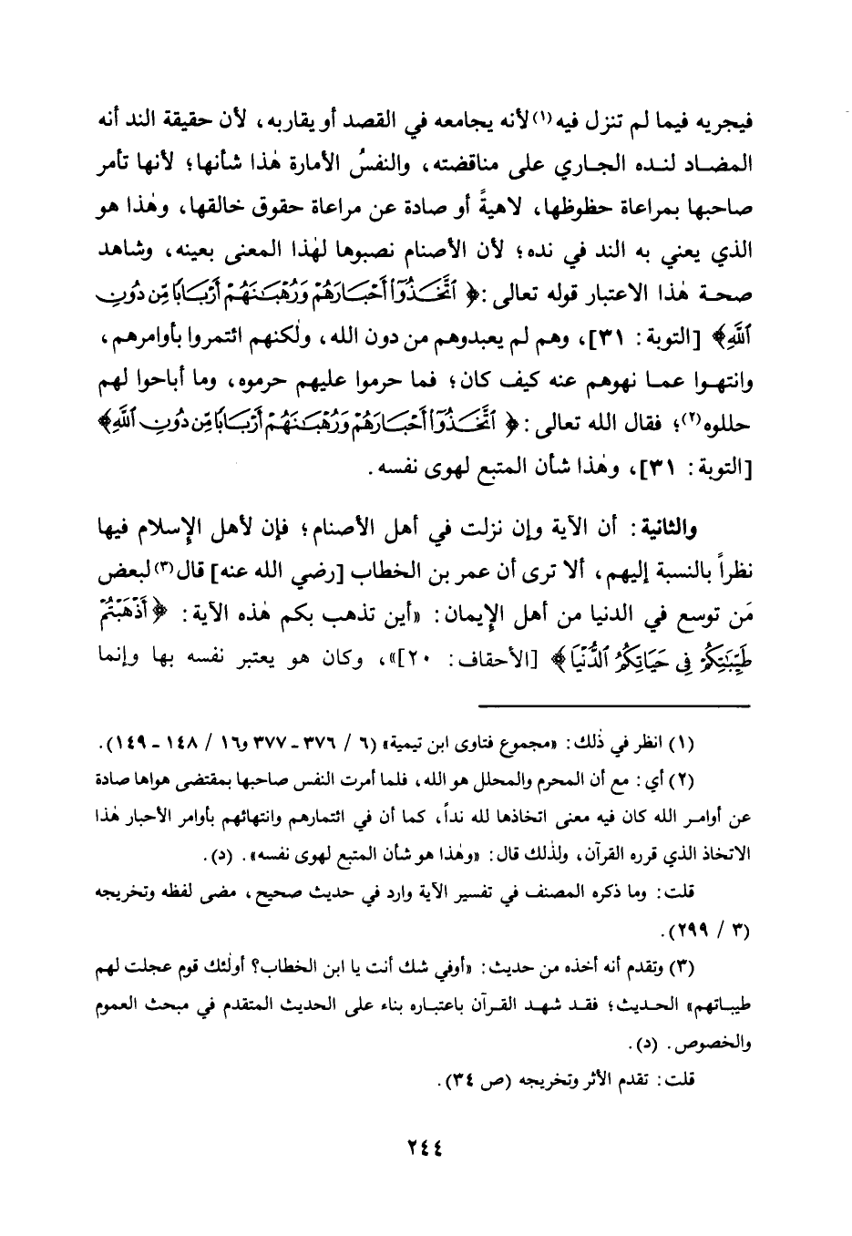 2 أي: مع أن المحرم والمحلل هو الله، فلما أمرت النفس صاحبها بمقتضى هواها صادة عن أوامر الله كان فيه معنى اتخاذها لله ندًّا، كما أن في ائتمارهم وانتهائهم بأوامر الأحبار هذا الاتخاذ الذي قرره القرآن، ولذلك قال: "وهذا هو شأن المتبع لهوى نفسه". "د".