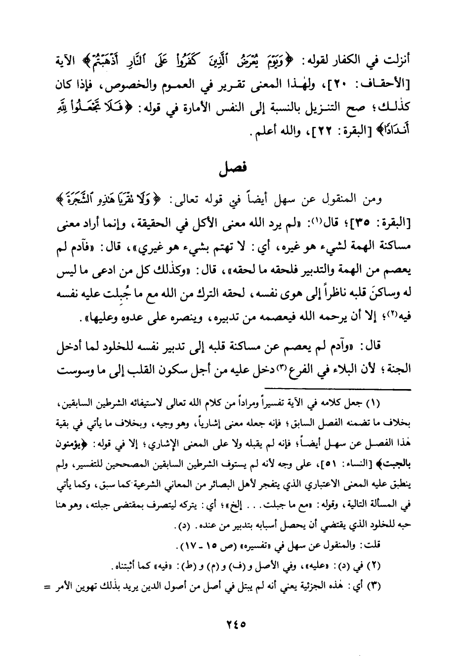 1 جعل كلامه في الآية تفسيرًا ومرادًا من كلام الله تعالى لاستيفائه الشرطين السابقين، بخلاف ما تضمنه الفصل السابق؛ فإنه جعله معنى إشاريًّا، وهو وجيه، وبخلاف ما يأتي في بقية هذا الفصل عن سهل أيضًا؛ فإنه لم يقبله ولا على المعنى الإشاري؛ إلا في قوله: {يُؤْمِنُونَ بِالْجِبْت} [النساء: 51] ، على وجه لأنه لم يستوفِ الشرطين السابقين المصححين للتفسير، ولم ينطبق عليه المعنى الاعتباري الذي يتفجر لأهل البصائر من المعاني الشرعية كما سبق، وكما يأتي في المسألة التالية، وقوله: "مع ما جبلت ... إلخ" أي: يتركه ليتصرف بمقتضى جبلته، وهو هنا حبه للخلود الذي يقتضي أن يحصل أسبابه بتدبير من عنده. "د".