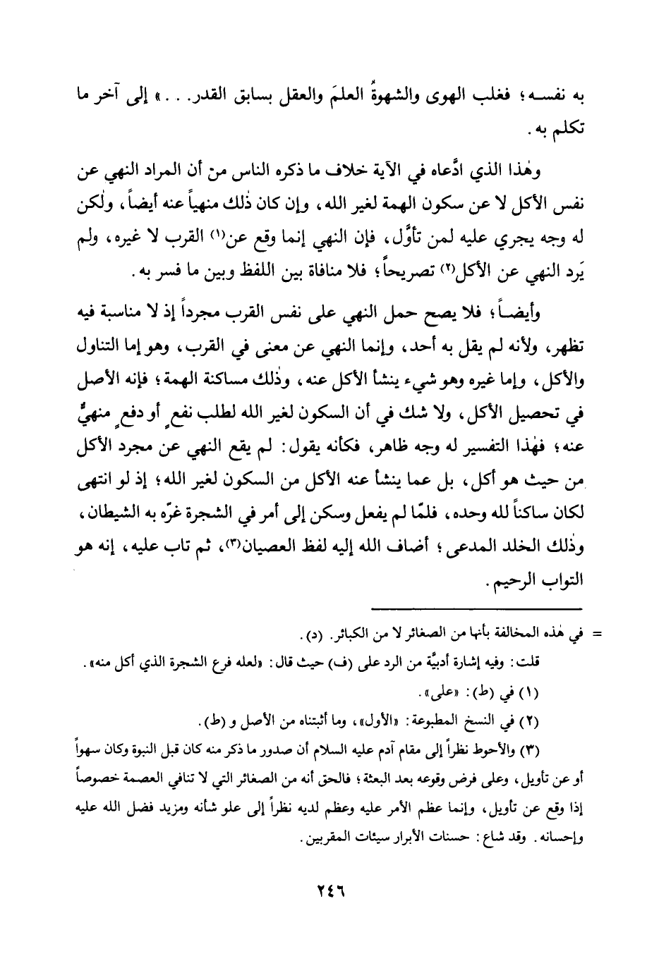 وَأَيْضًا؛ فَلَا يَصِحُّ حَمْلُ النَّهْيِ عَلَى نَفْسِ الْقُرْبِ مُجَرَّدًا إِذْ لَا مُنَاسَبَةَ فِيهِ تَظْهَرُ، وَلِأَنَّهُ لَمْ يَقُلْ بِهِ أَحَدٌ، وَإِنَّمَا النَّهْيُ عَنْ مَعْنًى فِي الْقُرْبِ، وَهُوَ إِمَّا التَّنَاوُلُ وَالْأَكْلُ، وَإِمَّا غَيْرُهُ وَهُوَ شَيْءٌ يَنْشَأُ الْأَكْلُ عَنْهُ وَذَلِكَ مُسَاكَنَةُ الْهِمَّةِ فَإِنَّهُ الْأَصْلُ فِي تَحْصِيلِ الْأَكْلِ وَلَا شَكَّ فِي أَنَّ السُّكُونَ لِغَيْرِ اللَّهِ لِطَلَبِ نَفْعٍ أَوْ دَفْعِ مَنْهِيٍّ عَنْهُ؛ فَهَذَا التَّفْسِيرُ لَهُ وَجْهٌ ظَاهِرٌ، فَكَأَنَّهُ يَقُولُ: لَمْ يَقَعِ النَّهْيُ عَنْ مُجَرَّدِ الْأَكْلِ مِنْ حَيْثُ هُوَ أَكْلٌ، بَلْ عَمَّا يَنْشَأُ عَنْهُ الْأَكْلُ مِنَ السُّكُونِ لِغَيْرِ اللَّهِ؛ إِذْ لَوِ انْتَهَى لَكَانَ سَاكِنًا لِلَّهِ وَحْدَهُ، فَلَمَّا لَمْ يَفْعَلْ وَسَكَنَ إِلَى أَمْرٍ فِي الشَّجَرَةِ غَرَّهُ بِهِ الشَّيْطَانُ، وَذَلِكَ الْخُلْدُ الْمُدَّعَى؛ أَضَافَ اللَّهُ إِلَيْهِ لَفْظَ الْعِصْيَانِ3، ثُمَّ تَابَ عليه، إنه هو التواب الرحيم.