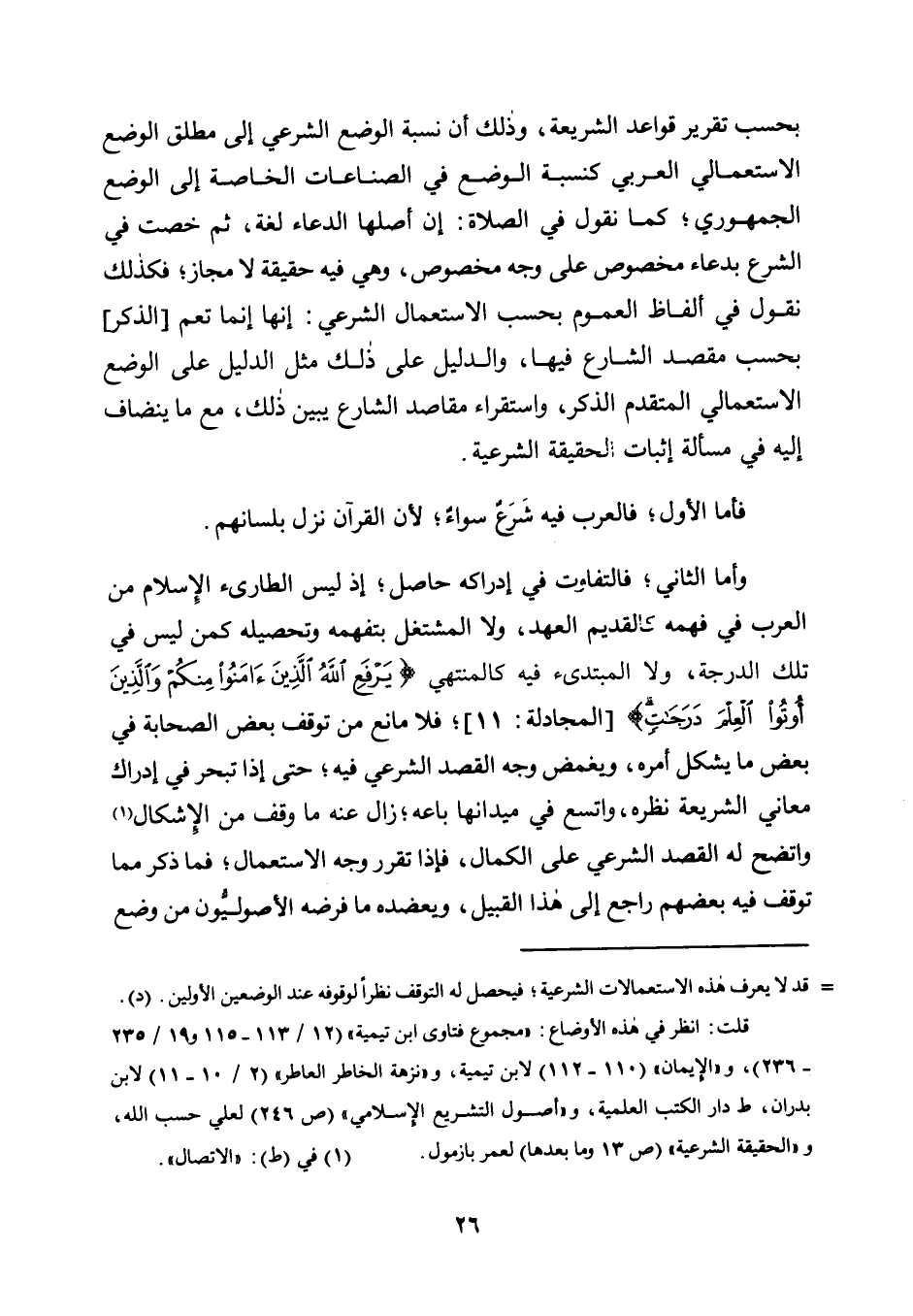 بِحَسَبِ تَقْرِيرِ قَوَاعِدِ الشَّرِيعَةِ، وَذَلِكَ أَنَّ نِسْبَةَ الْوَضْعِ الشَّرْعِيِّ إِلَى مُطْلَقِ الْوَضْعِ الِاسْتِعْمَالِيِّ الْعَرَبِيِّ كَنِسْبَةِ الْوَضْعِ فِي الصِّنَاعَاتِ الْخَاصَّةِ إِلَى الْوَضْعِ الْجُمْهُورِيِّ؛ كَمَا نَقُولُ فِي الصَّلَاةِ: إِنَّ أَصْلَهَا الدُّعَاءُ لُغَةً، ثُمَّ خُصَّتْ فِي الشَّرْعِ بِدُعَاءٍ مَخْصُوصٍ عَلَى وَجْهٍ مَخْصُوصٍ، وَهِيَ فِيهِ حَقِيقَةٌ لَا مَجَازٌ؛ فَكَذَلِكَ نَقُولُ فِي أَلْفَاظِ الْعُمُومِ بِحَسَبِ الِاسْتِعْمَالِ الشَّرْعِيِّ: إِنَّهَا إِنَّمَا تَعُمُّ [الذِّكْرَ] بِحَسَبِ مَقْصِدِ الشَّارِعِ فِيهَا، وَالدَّلِيلُ عَلَى ذَلِكَ مِثْلُ الدَّلِيلِ عَلَى الْوَضْعِ الِاسْتِعْمَالِيِّ الْمُتَقَدِّمِ الذِّكْرِ، وَاسْتِقْرَاءُ مَقَاصِدِ الشَّارِعِ يُبَيِّنُ ذَلِكَ، مَعَ مَا يَنْضَافُ إِلَيْهِ فِي مَسْأَلَةِ إِثْبَاتِ الْحَقِيقَةِ الشَّرْعِيَّةِ.
