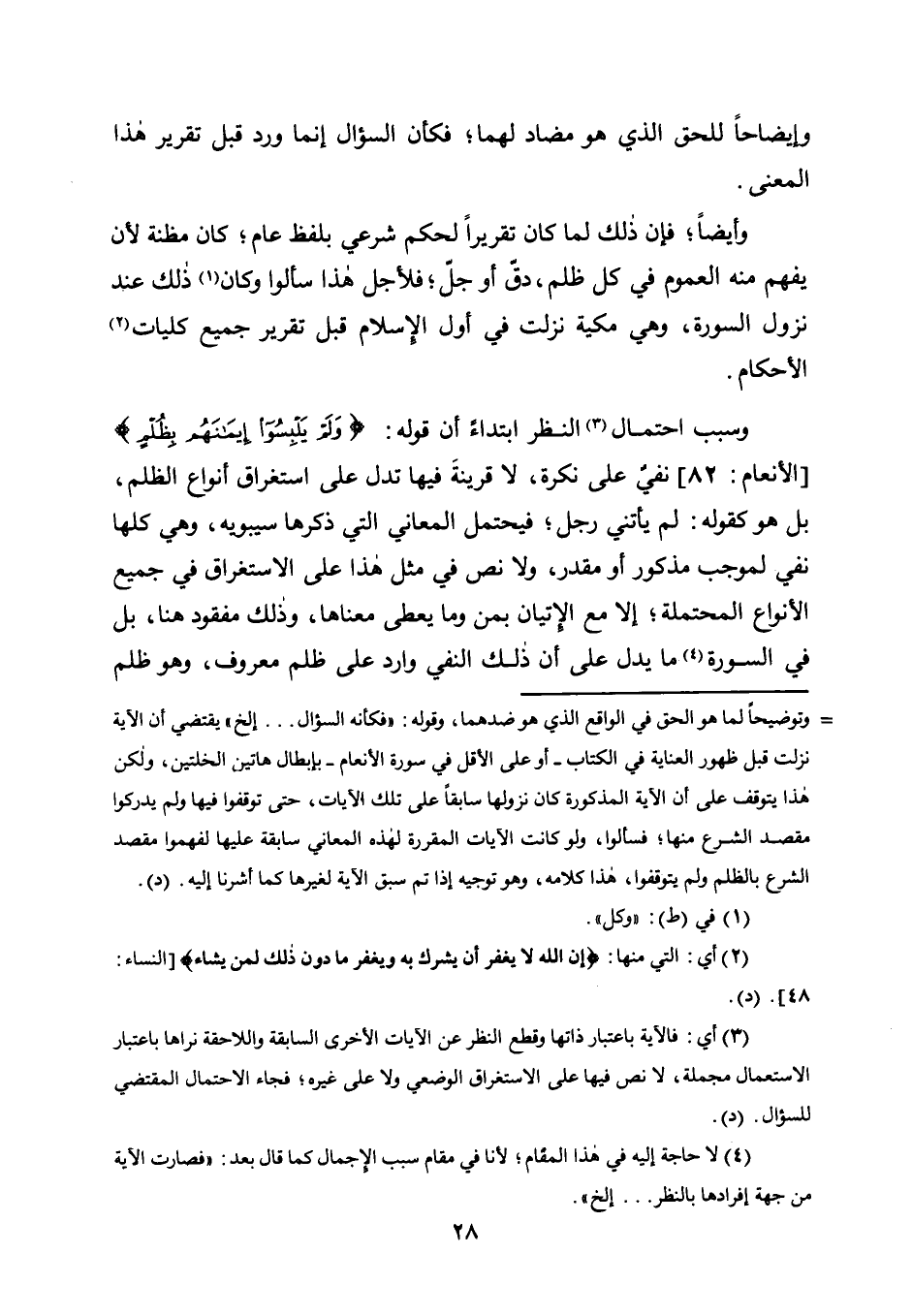 وَسَبَبُ احْتِمَالِ3 النَّظَرِ ابْتِدَاءً أَنَّ قَوْلَهُ: {وَلَمْ يَلْبِسُوا إِيمَانَهُمْ بِظُلْمٍ} [الْأَنْعَامِ: 82] نَفْيٌّ عَلَى نَكِرَةٍ، لَا قَرِينَةَ فِيهَا تَدُلُّ عَلَى اسْتِغْرَاقِ أَنْوَاعِ الظُّلْمِ، بَلْ هُوَ كَقَوْلِهِ: لَمْ يَأْتِنِي رَجُلٌ؛ فَيَحْتَمِلُ الْمَعَانِيَ الَّتِي ذَكَرَهَا سِيبَوَيْهِ، وَهِيَ كُلُّهَا نَفْيٌ لِمُوجِبٍ مَذْكُورٍ أَوْ مُقَدَّرٍ، وَلَا نَصَّ فِي مِثْلِ هَذَا عَلَى الِاسْتِغْرَاقِ فِي جَمِيعِ الْأَنْوَاعِ الْمُحْتَمِلَةِ؛ إِلَّا مَعَ الْإِتْيَانِ بِمَنْ وَمَا يُعْطِي مَعْنَاهَا، وَذَلِكَ مَفْقُودٌ هُنَا، بَلْ فِي السُّورَةِ4 مَا يَدُلُّ عَلَى أَنَّ ذَلِكَ النَّفْيَ وَارِدٌ على ظلم معروف، وهو ظلم
