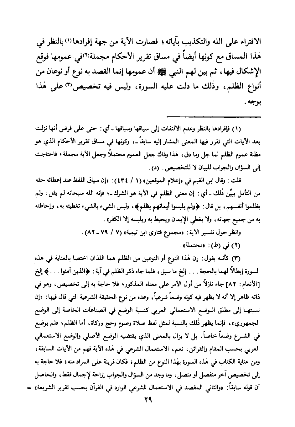 1 فإفرادها بالنظر وعدم الالتفات إلى سياقها وسباقها -أي: حتى على فرض أنها نزلت بعد الآيات التي تقرر فيها المعنى المشار إليه سابقًا- وكونها في مساق تقرير الأحكام الذي هو مظنة عموم الظلم لما جل وما دق، هذا وذاك جعل العموم محتملًا وجعل الآية مجملة، فاحتاجت إلى السؤال والجواب للبيان لا للتخصيص. "د".
