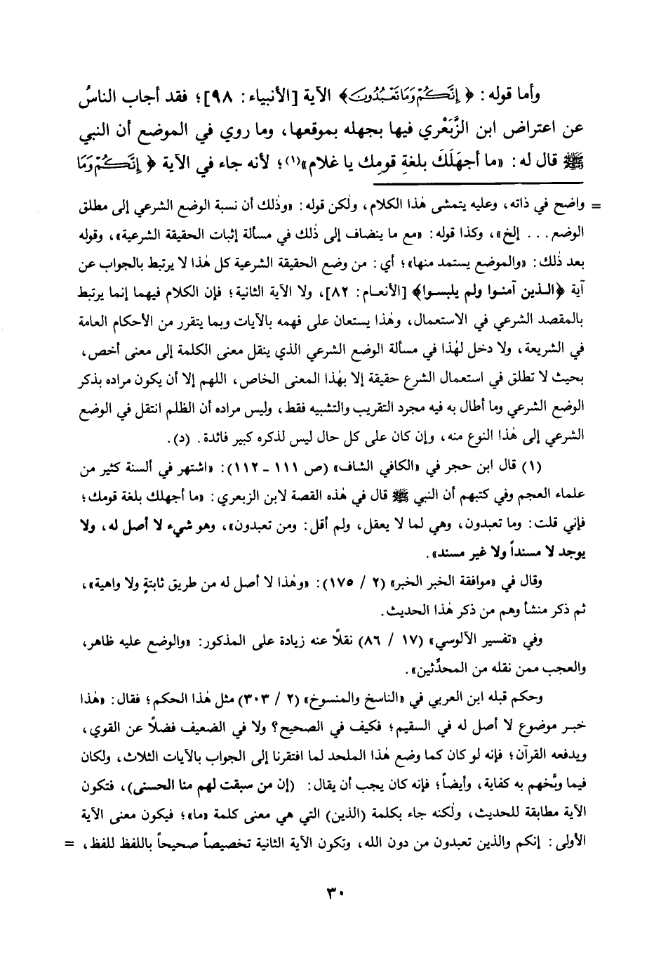 1 قال ابن حجر في "الكافي الشافي" "ص111-112": "اشتهر في ألسنة كثير من علماء العجم وفي كتبهم, أن النبي -صلى الله عليه وسلم- قال في هذه القصة لابن الزبعرى: "ما أجهلك بلغة قومك، فإني قلت: وما تعبدون، وهي لما لا يعقل، ولم أقل: ومن تعبدون"، وهو شيء لا أصل له، ولا يوجد لا مسندًا ولا غير مسند".
