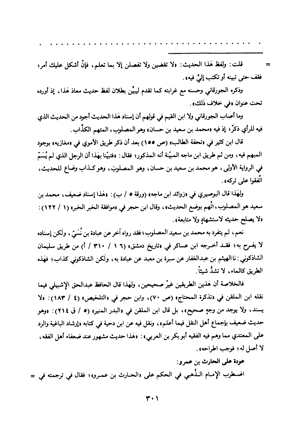 وما أصاب الجورقاني ولا ابن القيم في قولهم: إن إسناد هذا الحديث أجود من الحديث الذي فيه للرأي ذكر، إذ فيه "محمد بن سعيد بن حسان" وهو المصلوب، المتهم الكذاب.