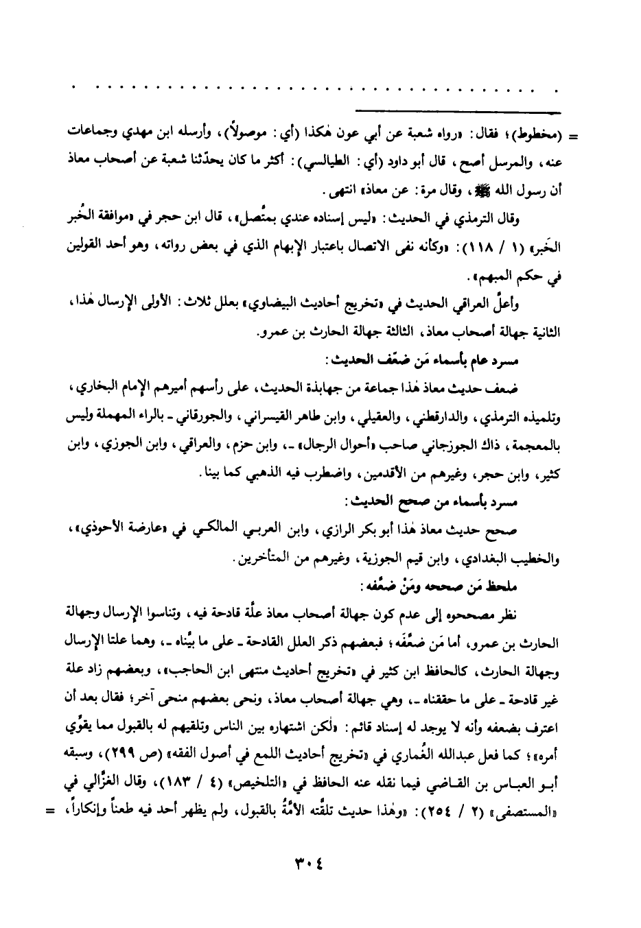 = "مخطوط"؛ فقال: "رواه شعبة عن أبي عون هكذا "أي: موصولًا"، وأرسله ابن مهدي وجماعات عنه، والمرسل أصح، قال أبو داود "أي: الطيالسي": أكثر ما كان يحدثنا شعبة عن أصحاب معاذ أن رسول الله -صلى الله عليه وسلم- وقال مرة: عن معاذ" ا. هـ.