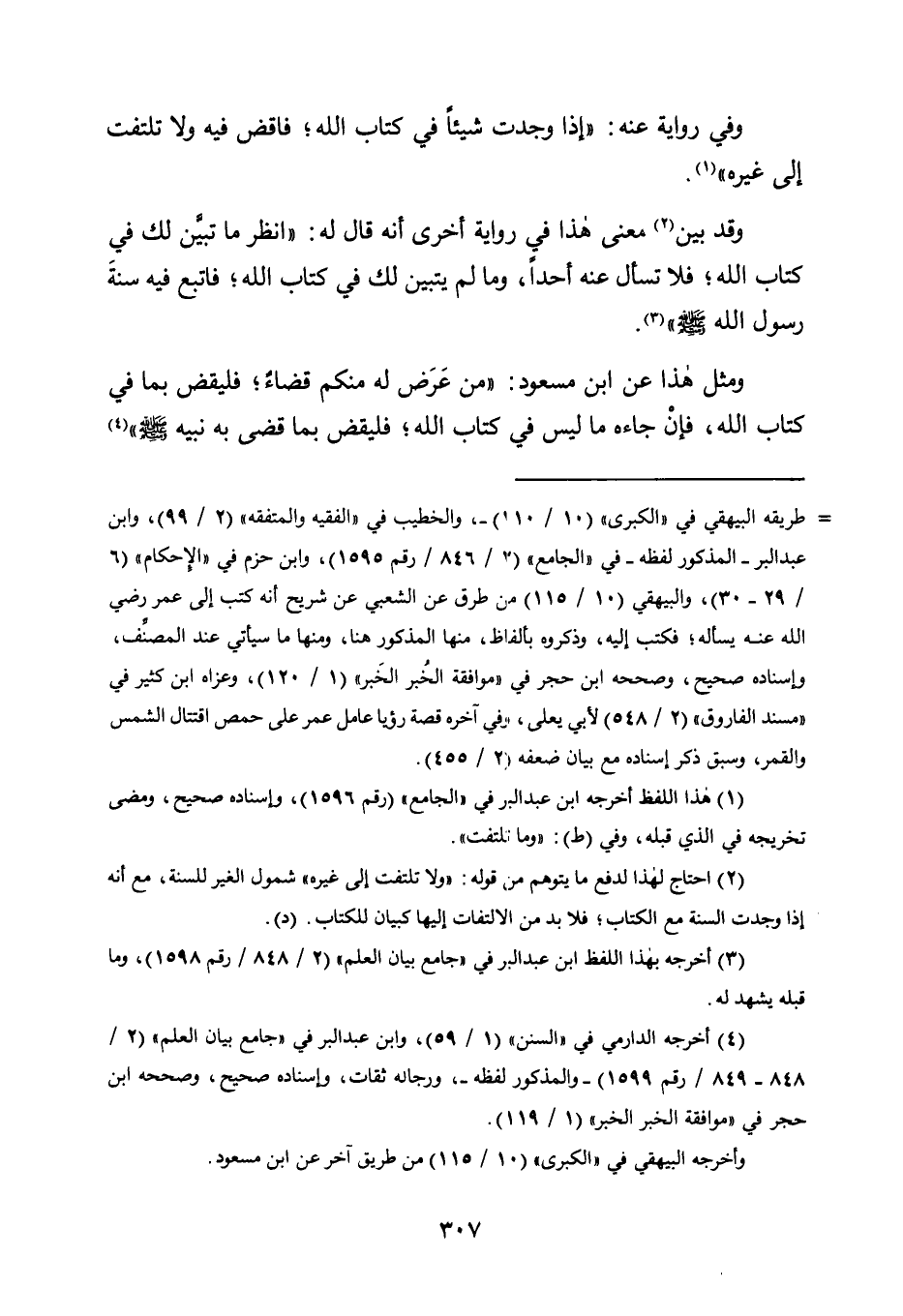 = طريقه البيهقي في "الكبري" "10/ 110", والخطيب في "الفقيه والمتفقه" "2/ 99"، وابن عبد البر -المذكور لفظه- في "الجامع" "2/ 846/ رقم 1595"، وابن حزم في "الإحكام" "6/ 29-30"، والبيهقي "10/ 115" من طرق عن الشعبي عن شريح أنه كتب إلى عمر -رضي الله عنه- يسأله؛ فكتب إليه، وذكروه بألفاظ، منها المذكور هنا، ومنها ما سيأتي عند المصنف، وإسناده صحيح؛ وصححه ابن حجر في "موافقة الخبر الخبر" "1/ 120"، وعزاه ابن كثير في "مسند الفاروق" "2/ 548" لأبي يعلى، وفي آخره قصة رؤيا عامل عمر على حمص اقتتال الشمس والقمر، وسبق ذكر إسناده مع بيان ضعفه "2/ 455".