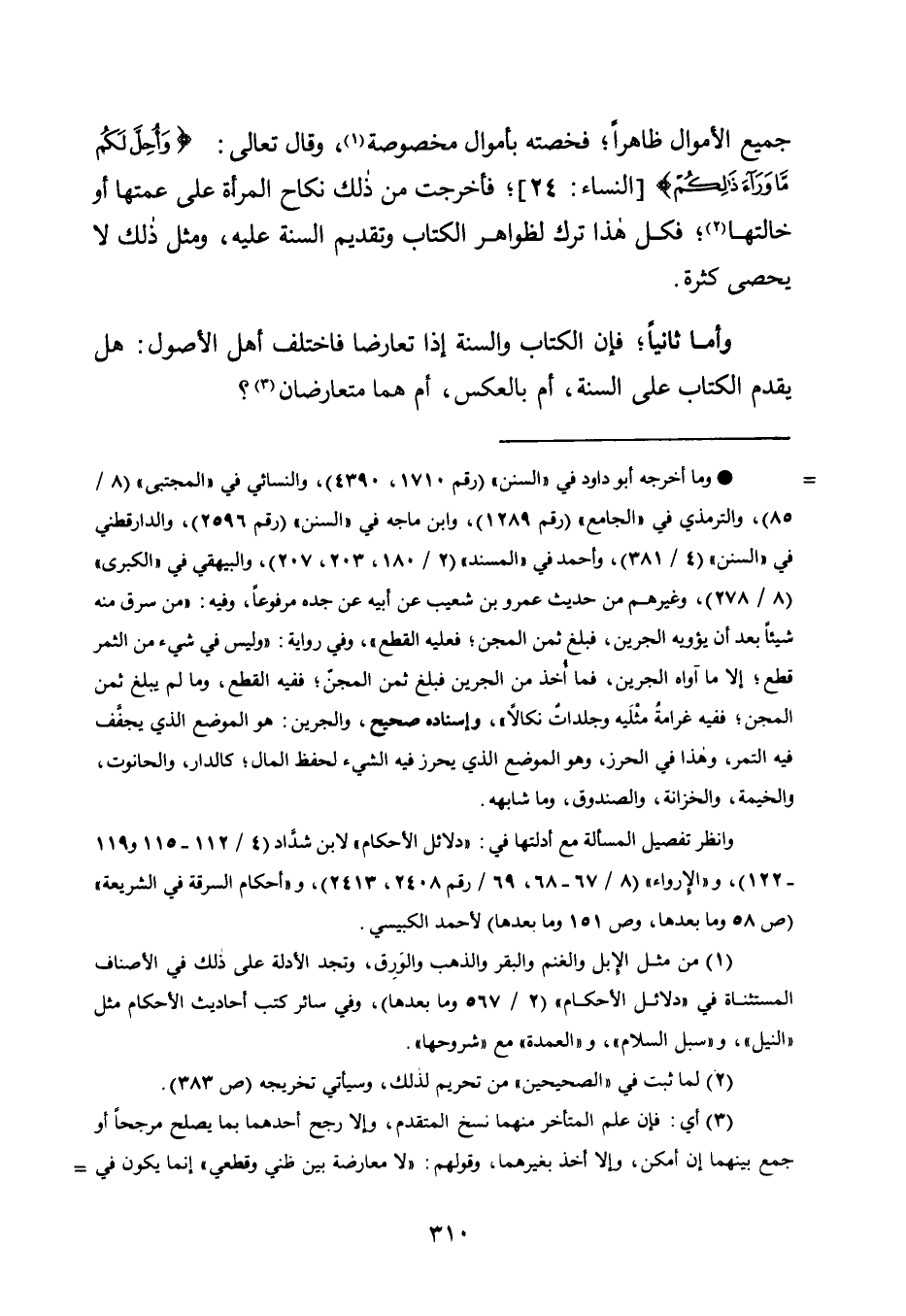 جَمِيعِ الْأَمْوَالِ ظَاهِرًا؛ فَخَصَّتْهُ بِأَمْوَالٍ مَخْصُوصَةٍ1، وَقَالَ تَعَالَى: {وَأُحِلَّ لَكُمْ مَا وَرَاءَ ذَلِكُم} [النِّسَاءِ: 24] ؛ فَأَخْرَجَتْ مِنْ ذَلِكَ نِكَاحَ الْمَرْأَةِ عَلَى عَمَّتِهَا أَوْ خَالَتِهَا2؛ فَكُلُّ هَذَا تَرْكٌ لِظَوَاهِرِ الْكِتَابِ وَتَقْدِيمُ السُّنَّةِ عَلَيْهِ، وَمِثْلُ ذَلِكَ لَا يُحْصَى كَثْرَةً.