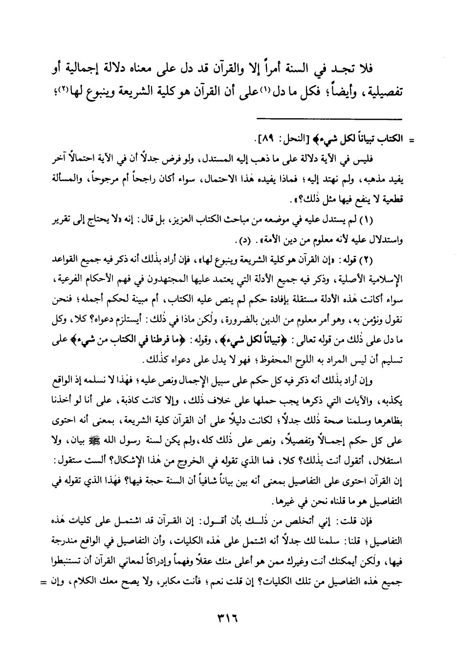 وإن أراد بذلك أنه ذكر فيه كل حكم على سبيل الإجمال ونص عليه؛ فهذا لا نسلمه إذ الواقع يكذبه، والآيات التي ذكرها يجب حملها على خلاف ذلك، وإلا كانت كاذبة، على أنا لو أخذنا بظاهرها وسلمنا صحة ذلك جدلًا؛ لكانت دليلًا على أن القرآن كلية الشريعة، بمعنى أنه احتوى على كل حكم إجمالًا وتفصيلًا، ونص على ذلك كله، ولم يكن لسنة رسول الله -صلى الله عليه وسلم- بيان، ولا استقلال، أتقول أنت بذلك؟ كلا، فما الذي تقوله في الخروج من هذا الإشكال؟ ألست ستقول: إن القرآن احتوى على التفاصيل بمعنى أنه بين بيانًا شافيًا أن السنة حجة فيها؟ فهذا الذي تقوله في التفاصيل هو ما قلناه نحن في غيرها.