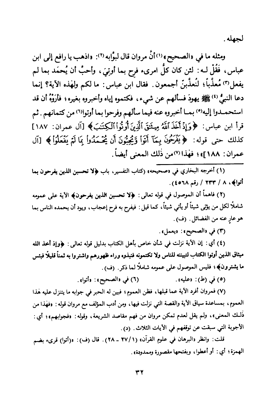 7 فمروان أفرد الآية عما قبلها، فظن العموم؛ فبين له الحبر في جوابه ما يتنزل عليه هذا العموم، بمساعدة سياق الآية والقصة التي نزلت فيها، ومن أدب المؤلف مع مروان قوله: "فهذا من ذلك المعنى"، ولم يقل لعدم تمكن مروان من فهم مقاصد الشريعة، وقوله: "فجوابهم"؛ أي: الأجوبة التي سبقت عن توقفهم في الآيات الثلاث. "د".
