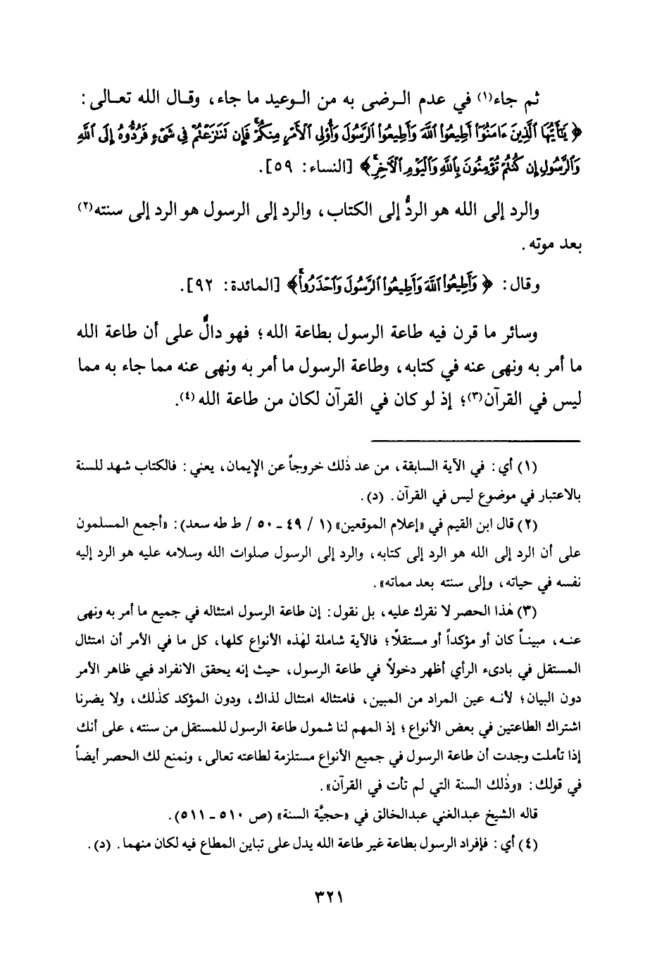 1 أي: في الآية السابقة، من عد ذلك خروجًا عن الإيمان، يعني: فالكتاب شهد للسنة بالاعتبار في موضوع ليس في القرآن. "د".