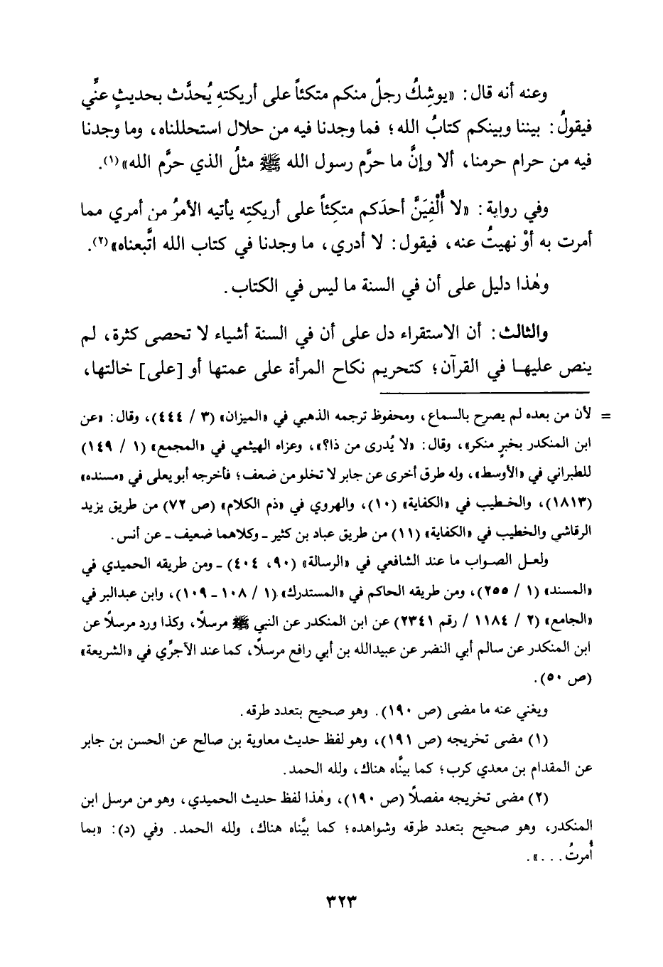 وَالثَّالِثُ: أَنَّ الِاسْتِقْرَاءَ دَلَّ عَلَى أَنَّ فِي السُّنَّةِ أَشْيَاءَ لَا تُحْصَى كَثْرَةً، لَمْ يُنَصَّ عَلَيْهَا فِي الْقُرْآنِ؛ كَتَحْرِيمِ نِكَاحِ المرأة على عمتها أو [على] خالتها،