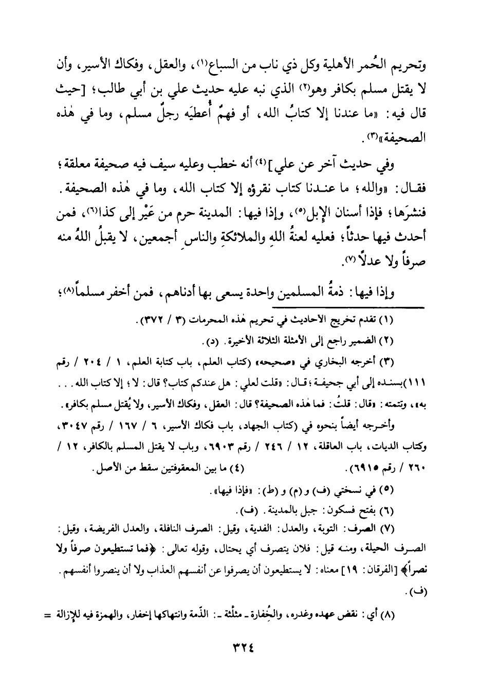 3 أخرجه البخاري في "صحيحه" "كتاب العلم، باب كتابة العلم، 1/ 204/ رقم 111" بسنده إلى أبي جحيفة؛ قال: "قلت لعلي: هَلْ عِنْدَكُمْ كِتَابٌ؟ قَالَ: لَا؛ إِلَّا كِتَابُ الله.... به"، وتتمته: "قال: قلت: فما هذه الصحيفة؟ قال: العقل، وفكاك الأسير، ولا يقتل مسلم بكافر".