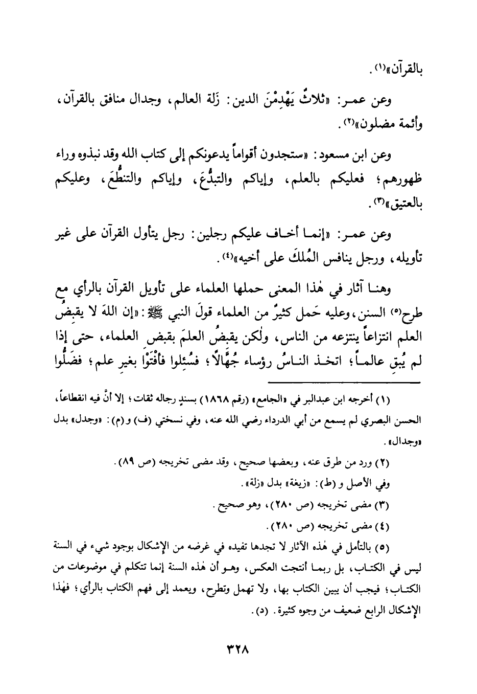 وَهُنَا آثَارٌ فِي هَذَا الْمَعْنَى حَمَلَهَا الْعُلَمَاءُ عَلَى تَأْوِيلِ الْقُرْآنِ بِالرَّأْيِ مَعَ طَرْحِ5 السُّنَنِ وَعَلَيْهِ حَمَلَ كَثِيرٌ مِنَ الْعُلَمَاءِ قَوْلَ النَّبِيِّ, صَلَّى اللَّهُ عَلَيْهِ وَسَلَّمَ: "إِنَّ اللَّهَ لَا يَقْبِضُ الْعِلْمَ انْتِزَاعًا يَنْتَزِعُهُ مِنَ النَّاسِ، وَلَكِنْ يَقْبِضُ الْعِلْمَ بِقَبْضِ الْعُلَمَاءِ، حَتَّى إِذَا لَمْ يُبْقِ عَالِمًا؛ اتَّخَذَ النَّاسُ رُؤَسَاءً جُهَّالًا؛ فَسُئِلُوا فَأَفْتَوْا بِغَيْرِ علم؛ فضلوا