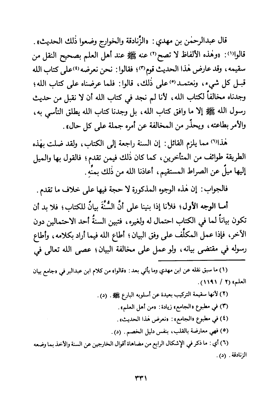 هَذَا6 مِمَّا يُلْزِمُ الْقَائِلَ: إِنَّ السُّنَّةَ رَاجِعَةٌ إِلَى الْكِتَابِ، وَلَقَدْ ضَلَّتْ بِهَذِهِ الطَّرِيقَةِ طَوَائِفُ مِنَ الْمُتَأَخِّرِينَ، كَمَا كَانَ ذَلِكَ فِيمَنْ تَقَدَّمَ؛ فَالْقَوْلُ بِهَا وَالْمَيْلُ إِلَيْهَا مَيْلٌ عَنِ الصِّرَاطِ الْمُسْتَقِيمِ، أَعَاذَنَا اللَّهُ مِنْ ذَلِكَ بِمَنِّهِ.