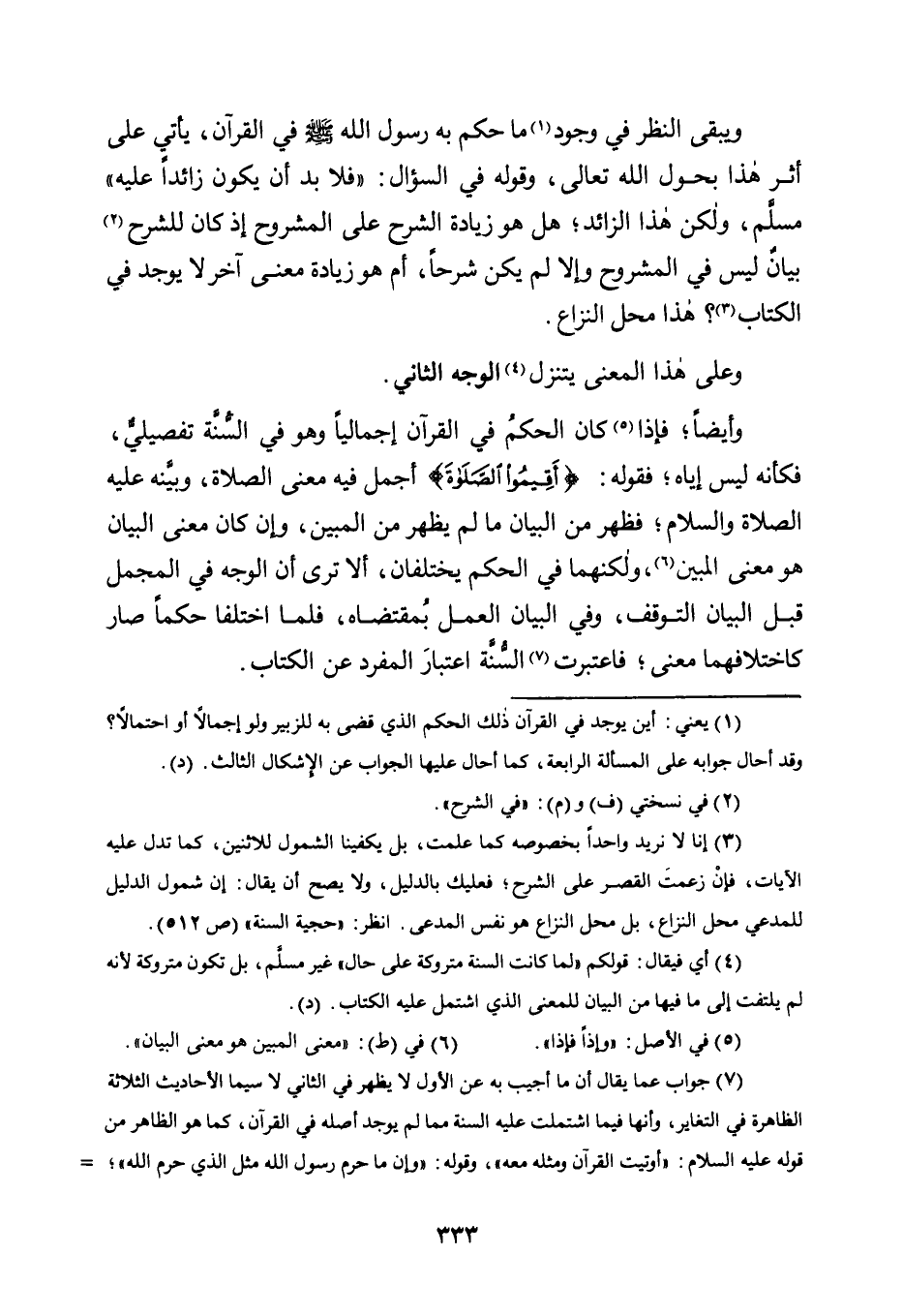 وَيَبْقَى النَّظَرُ فِي وُجُودِ1 مَا حَكَمَ بِهِ رَسُولُ اللَّهِ -صَلَّى اللَّهُ عَلَيْهِ وَسَلَّمَ- في الْقُرْآنِ، يَأْتِي عَلَى أَثَرِ هَذَا بِحَوَلِ اللَّهِ تَعَالَى، وَقَوْلُهُ فِي السُّؤَالِ: "فَلَا بُدَّ أَنْ يَكُونَ زَائِدًا عَلَيْهِ" مُسَلَّمٌ، وَلَكِنَّ هَذَا الزَّائِدَ؛ هَلْ هُوَ زِيَادَةُ الشَّرْحِ عَلَى الْمَشْرُوحِ إِذْ كَانَ لِلشَّرْحِ2 بَيَانٌ لَيْسَ فِي الْمَشْرُوحِ وَإِلَّا لَمْ يَكُنْ شَرْحًا، أَمْ هُوَ زِيَادَةُ مَعْنًى آخَرَ لَا يُوجَدُ فِي الْكِتَابِ3؟ هَذَا مَحَلُّ النِّزَاعِ.