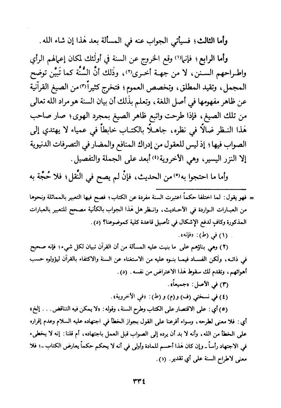 وَأَمَّا الرَّابِعُ؛ فَإِنَّمَا1 وَقَعَ الْخُرُوجُ عَنِ السُّنَّةِ فِي أُولَئِكَ لِمَكَانِ إِعْمَالِهِمُ الرَّأْيَ وَاطِّرَاحِهِمُ السُّنَنَ، لَا مِنْ جِهَةٍ أُخْرَى2، وَذَلِكَ أَنَّ السُّنَّةَ كَمَا تَبَيَّنَ تُوَضِّحُ الْمُجْمَلَ، وَتُقَيِّدُ الْمُطْلَقَ، وَتُخَصِّصُ الْعُمُومَ؛ فَتُخْرِجُ كَثِيرًا3 مِنَ الصِّيَغِ الْقُرْآنِيَّةِ عَنْ ظَاهِرِ مَفْهُومِهَا فِي أَصْلِ اللُّغَةِ، وَتَعْلَمُ بِذَلِكَ أَنَّ بَيَانَ السُّنَّةِ هُوَ مُرَادُ اللَّهِ تَعَالَى مِنْ تِلْكَ الصِّيَغِ، فَإِذَا طُرِحَتْ وَاتُّبِعَ ظَاهِرُ الصِّيَغِ بِمُجَرَّدِ الْهَوَى؛ صَارَ صَاحِبُ هَذَا النَّظَرِ ضَالًّا فِي نَظَرِهِ، جَاهِلًا بِالْكِتَابِ خَابِطًا فِي عَمْيَاءَ لَا يَهْتَدِي إِلَى الصَّوَابِ فِيهَا؛ إِذْ لَيْسَ لِلْعُقُولِ مِنْ إِدْرَاكِ الْمَنَافِعِ وَالْمَضَارِّ فِي التَّصَرُّفَاتِ الدُّنْيَوِيَّةِ إِلَّا النَّزْرِ الْيَسِيرِ، وَهِيَ الْأُخْرَوِيَّةُ4 أَبْعَدُ عَلَى الْجُمْلَةِ وَالتَّفْصِيلِ.