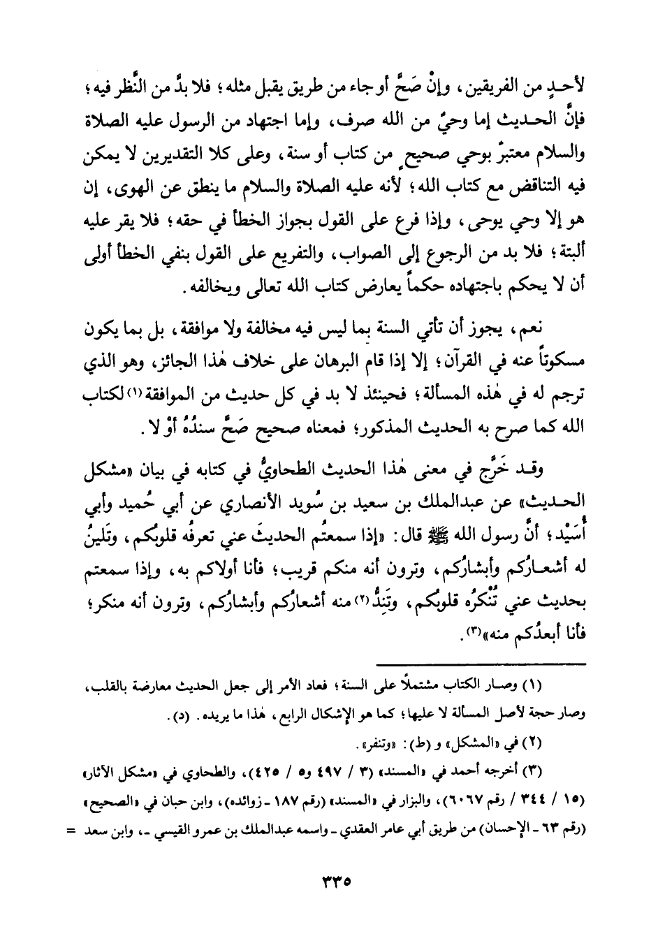 1 وصار الكتاب مشتملًا على السنة؛ فعاد الأمر إلى جعل الحديث معارضة بالقلب، وصار حجة لأصل المسألة لا عليها؛ كما هو الإشكال الرابع، هذا ما يريده. "د".