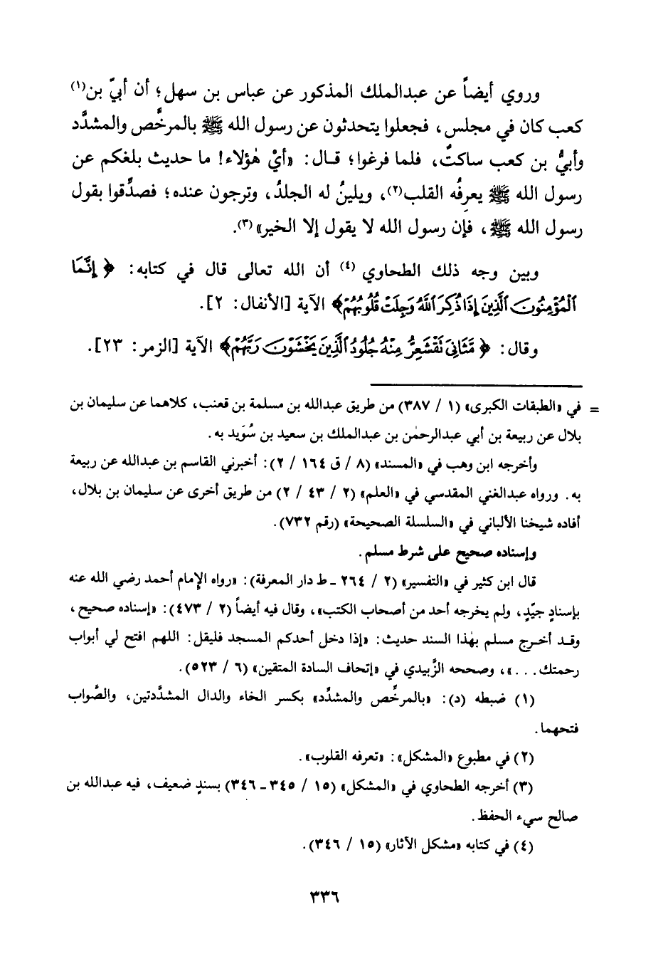 وَبَيَّنَ وَجْهَ ذَلِكَ الطَّحَاوِيُّ4 أَنَّ اللَّهَ تَعَالَى قَالَ فِي كِتَابِهِ: {إِنَّمَا الْمُؤْمِنُونَ الَّذِينَ إِذَا ذُكِرَ اللَّهُ وَجِلَتْ قُلُوبُهُمْ} الْآيَةَ [الْأَنْفَالِ: 2] .