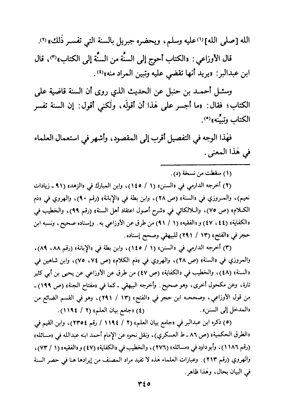 قَالَ الْأَوْزَاعِيُّ: "الْكِتَابُ أَحْوَجُ إِلَى السُّنَّةِ مِنَ السُّنَّةِ إِلَى الْكِتَابِ"3، قَالَ ابْنُ عَبْدِ الْبَرِّ: "يُرِيدُ أَنَّهَا تَقْضِي عَلَيْهِ وَتُبَيِّنُ الْمُرَادَ مِنْهُ"4.