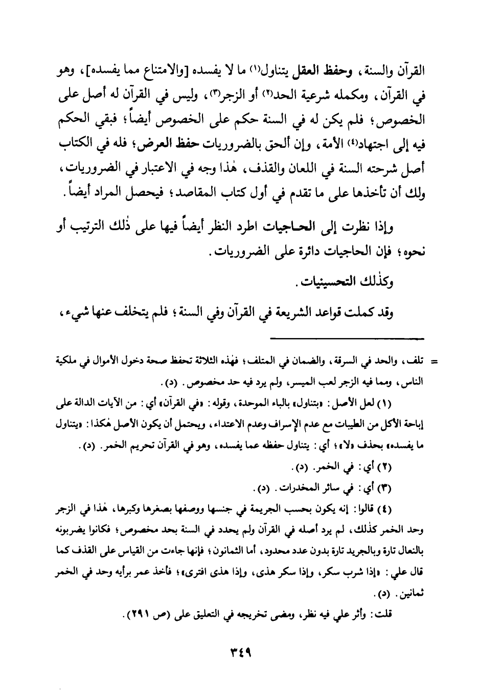 الْقُرْآنِ وَالسُّنَّةِ، وَحِفْظُ الْعَقْلِ يَتَنَاوَلُ1 مَا لَا يُفْسِدُهُ [وَالِامْتِنَاعَ مِمَّا يُفْسِدُهُ] ، وَهُوَ فِي الْقُرْآنِ، وَمُكَمِّلُهُ شَرْعِيَّةُ الْحَدِّ2 أَوِ الزَّجْرِ3، وَلَيْسَ فِي الْقُرْآنِ لَهُ أَصْلٌ عَلَى الْخُصُوصِ؛ فَلَمْ يَكُنْ لَهُ فِي السُّنَّةِ حُكْمٌ عَلَى الْخُصُوصِ أَيْضًا؛ فَبَقِيَ الْحُكْمُ فِيهِ إِلَى اجْتِهَادِ4 الْأُمَّةِ، وَإِنْ أُلْحِقَ بِالضَّرُورِيَّاتِ حِفْظُ الْعِرْضِ؛ فَلَهُ فِي الْكِتَابِ أَصْلٌ شَرَحَتْهُ السُّنَّةُ فِي اللِّعَانِ وَالْقَذْفِ، هَذَا وَجْهٌ فِي الِاعْتِبَارِ فِي الضَّرُورِيَّاتِ، وَلَكَ أَنْ تَأْخُذَهَا عَلَى مَا تَقَدَّمَ فِي أَوَّلِ كِتَابِ الْمَقَاصِدِ؛ فَيَحْصُلُ الْمُرَادُ أَيْضًا.