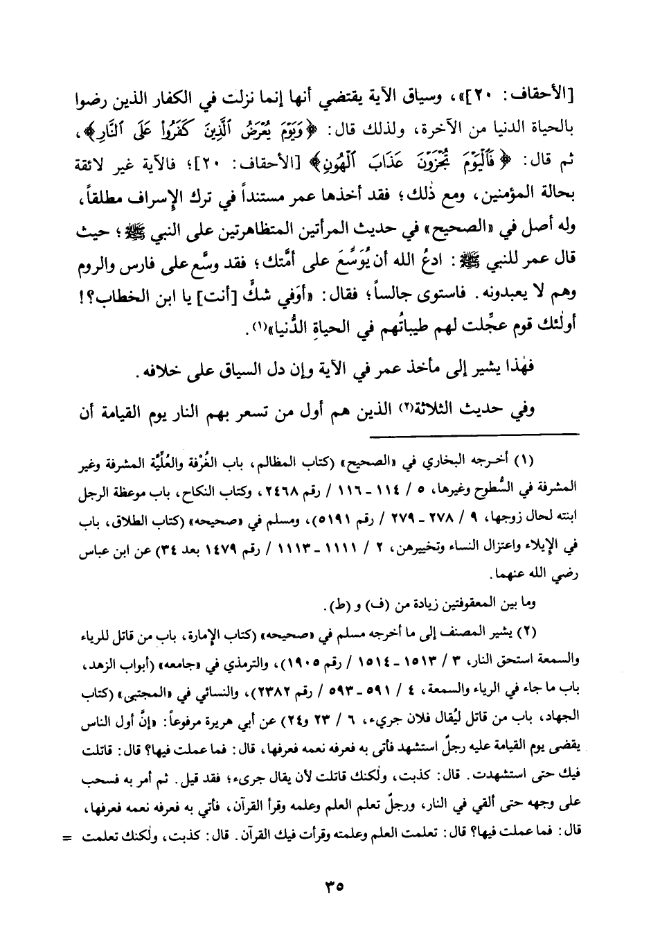 [الْأَحْقَافِ: 20] "، وَسِيَاقُ الْآيَةِ يَقْتَضِي أَنَّهَا إِنَّمَا نَزَلَتْ فِي الْكُفَّارِ الَّذِينَ رَضُوا بِالْحَيَاةِ الدُّنْيَا مِنَ الْآخِرَةِ، وَلِذَلِكَ قَالَ: {وَيَوْمَ يُعْرَضُ الَّذِينَ كَفَرُوا عَلَى النَّارِ} ، ثُمَّ قَالَ: {فَالْيَوْمَ تُجْزَوْنَ عَذَابَ الْهُونِ} [الْأَحْقَافِ: 20] ؛ فَالْآيَةُ غَيْرُ لَائِقَةٍ بِحَالَةِ الْمُؤْمِنِينَ، وَمَعَ ذَلِكَ؛ فَقَدْ أَخَذَهَا عُمَرُ مُسْتَنِدًا فِي تَرْكِ الْإِسْرَافِ مُطْلَقًا، وَلَهُ أَصْلٌ فِي "الصَّحِيحِ" فِي حَدِيثِ الْمَرْأَتَيْنِ الْمُتَظَاهِرَتَيْنِ عَلَى النَّبِيِّ -صَلَّى اللَّهُ عَلَيْهِ وَسَلَّمَ- حَيْثُ قَالَ عُمَرُ لِلنَّبِيِّ, صَلَّى اللَّهُ عَلَيْهِ وَسَلَّمَ: ادْعُ اللَّهَ أَنْ يُوَسِّعَ عَلَى أُمَّتِكَ؛ فَقَدْ وَسَّعَ عَلَى فَارِسَ وَالرُّومِ وَهُمْ لَا يَعْبُدُونَهُ. فَاسْتَوَى جَالِسًا؛ فَقَالَ: "أوفي شك [أنت] يابن الْخَطَّابِ؟! أُولَئِكَ قَوْمٌ عُجِّلَتْ لَهُمْ طَيِّبَاتُهُمْ فِي الْحَيَاةِ الدُّنْيَا" 1.