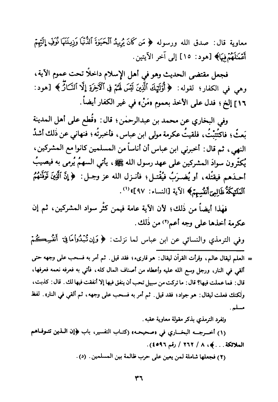 فَجَعَلَ مُقْتَضَى الْحَدِيثِ وَهُوَ فِي أَهْلِ الْإِسْلَامِ دَاخِلًا تَحْتَ عُمُومِ الْآيَةِ، وَهِيَ فِي الْكُفَّارِ؛ لِقَوْلِهِ: {أُولَئِكَ الَّذِينَ لَيْسَ لَهُمْ فِي الْآخِرَةِ إِلَّا النَّارُ} [هُودٍ: 16] إِلَخْ، فَدَلَّ عَلَى الْأَخْذِ بِعُمُومِ "مَنْ" فِي غَيْرِ الْكُفَّارِ أَيْضًا.
