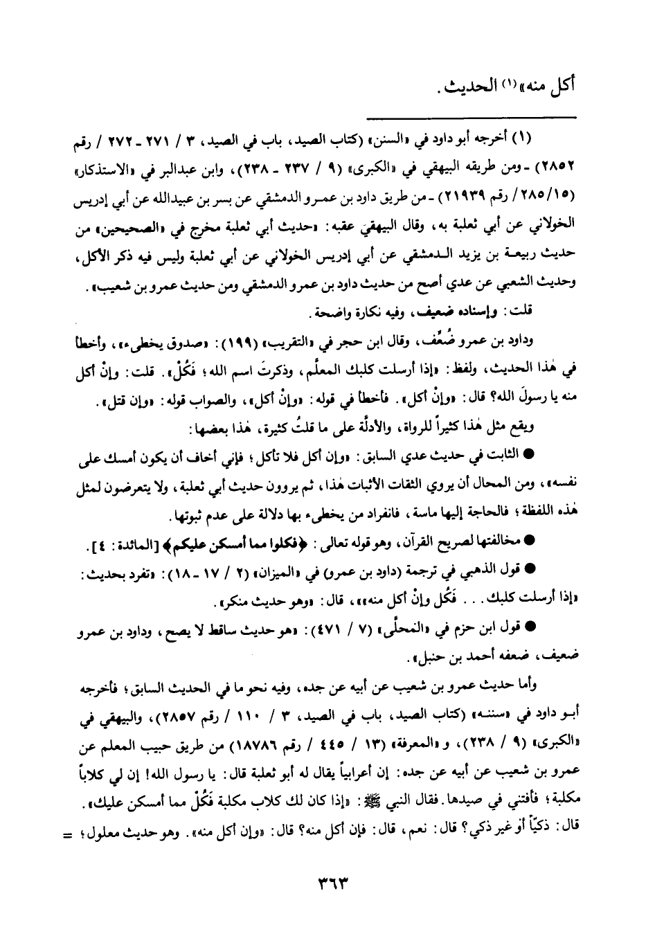 1 أخرجه أبو داود في "السنن" "كتاب الصيد، باب في الصيد، 3/ 271-272/ رقم 2852" -ومن طريقه البيهقي في "الكبرى" "9/ 237-238"، وابن عبد البر في "الاستذكار" "15/ 285/ رقم 21939"- من طريق داود بن عمرو الدمشقي عن بسر بن عبيد الله عن أبي إدريس الخولاني عن أبي ثعلبة به، وقال البيهقي عقبه: "حديث أبي ثعلبة مخرج في "الصحيحين" من حديث ربيعة بن يزيد الدمشقي عن أبي إدريس الخولاني عن أبي ثعلبة وليس فيه ذكر الأكل، وحديث الشعبي عن عدي أصح من حديث داود بن عمرو الدمشقي ومن حديث عمرو بن شعيب".