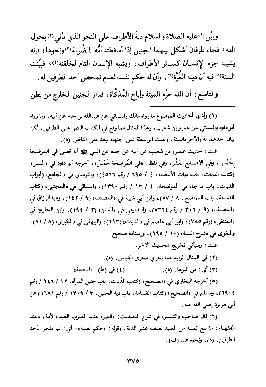 وَبَيَّنَ1 عَلَيْهِ الصَّلَاةُ وَالسَّلَامُ دِيَةَ الْأَطْرَافِ عَلَى النَّحْوِ الَّذِي يَأْتِي2 بِحَوْلِ اللَّهِ؛ فَجَاءَ طَرَفَانِ أُشْكِلَ بَيْنَهُمَا الْجَنِينُ إِذَا أَسْقَطَتْهُ أُمُّهُ بِالضَّرْبَةِ3 وَنَحْوِهَا؛ فَإِنَّهُ يُشْبِهُ جُزْءَ الْإِنْسَانِ كَسَائِرِ الْأَطْرَافِ، وَيُشْبِهُ الْإِنْسَانَ التَّامَّ لِخِلْقَتِهِ4؛ فَبَيَّنَتِ السُّنَّةُ5 فِيهِ أَنَّ دِيَتَهُ الْغُرَّةُ6، وَأَنَّ لَهُ حُكْمُ نَفْسِهِ لِعَدَمِ تَمَحُّضِ أَحَدِ الطَّرَفَيْنِ لَهُ.