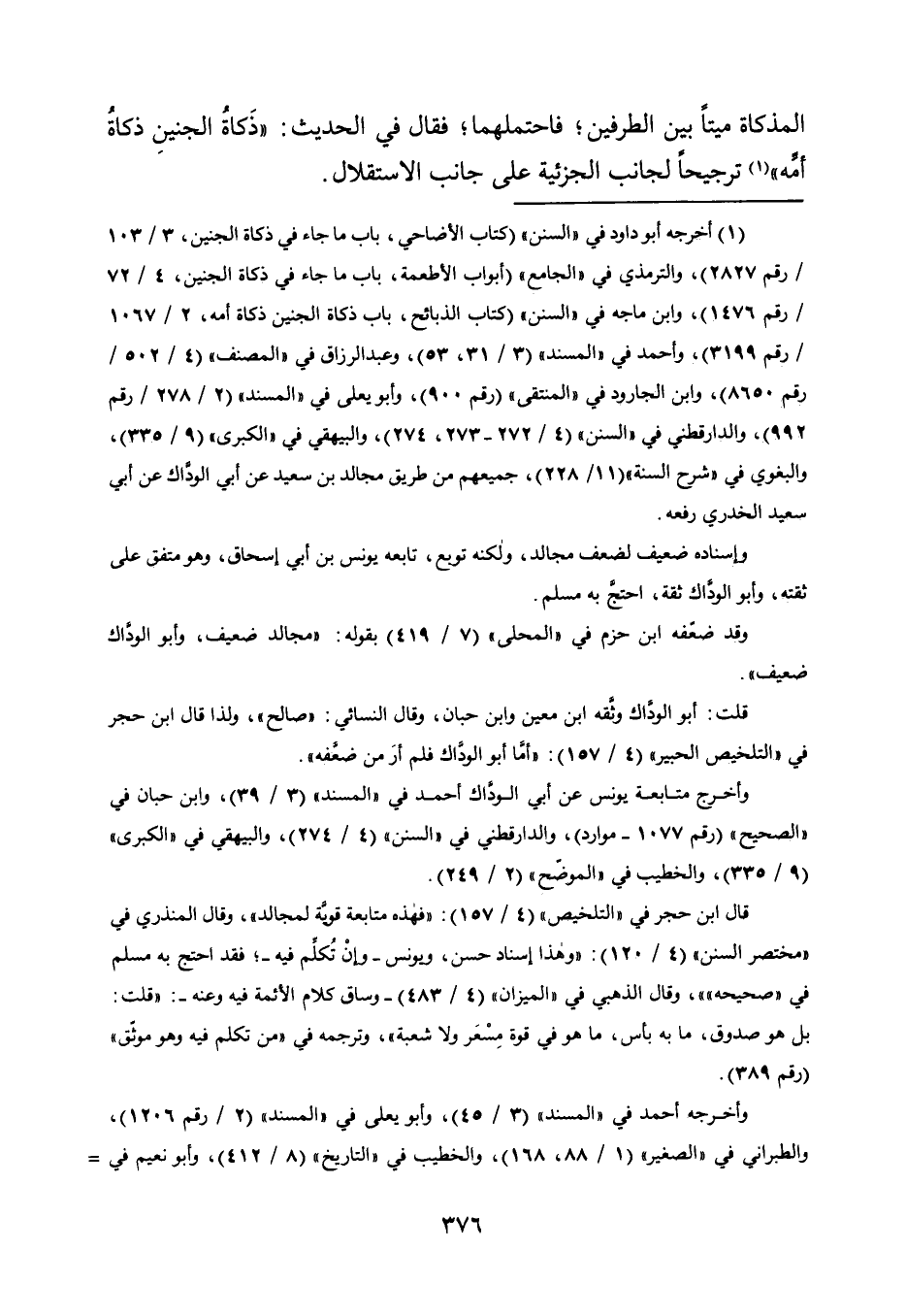 1 أخرجه أبو داود في "السنن" "كتاب الأضاحي، باب ما جاء في ذكاة الجنين، 3/ 103/ رقم 2827"، والترمذي في "الجامع" "أبواب الأطعمة، باب ما جاء في ذكاة الجنين، 4/ 72/ رقم 1476"، وابن ماجه في "السنن" "كتاب الذبائح، باب ذكاة الجنين ذكاة أمه، 2/ 1067/ رقم 3199"، وأحمد في "المسند" "3/ 31، 53"، وعبد الرزاق في "المصنف" "4/ 502/ رقم 8650"، وابن الجارود في "المنتقى" "رقم 900"، وأبو يعلى في "المسند" "2/ 278/ رقم 992"، والدارقطني في "السنن" "4/ 272-273، 274"، والبيهقي في "الكبرى" "9/ 335"، والبغوي في "شرح السنة" "11/ 228"، جميعهم من طريق مجالد بن سعيد عن أبي الوداك عن أبي سعيد الخدري رفعه.