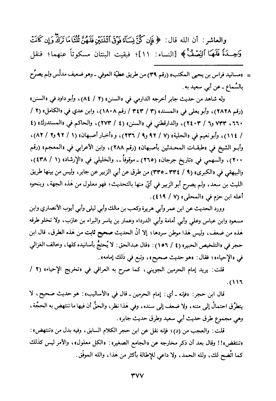 قلت: والعجب من "د"؛ فإنه نقل عن ابن حجر الكلام السابق، وفيه بدل من "تنتهض": "تنتقض"!! وقال بعد أن ذكر مخارجه عن "الجامع الصغير": "الكل معلول"، والأمر ليس كذلك كما اتضح لك، ولله الحمد، ولا داعي للإطالة بأكثر من هذا، والله الموفق.