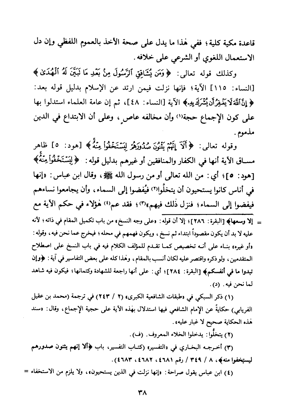4 ابن عباس يقول صراحة: "إنها نزلت في الذين يستحيون"، ولا يلزم من الاستخفاء بمعنى الاستحياء النفاق أو الكفر؛ فهو يخالف غيره في سبب النزول؛ فلا يجعلها في الكفار ثم يسحب حكمها على بعض المؤمنين حتى تجعل الآية مما نحن فيه، فما لم يقل ابن عباس صراحة أنها نزلت في الكفار وأنها تشمل من استحيا ... إلخ، ثم يكن لذكرها ههنا وجه. "د".