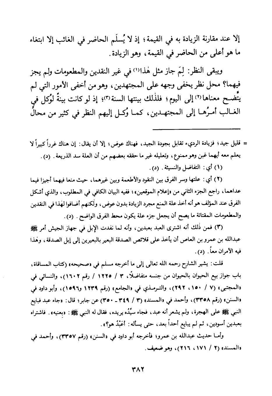 2 أي: علتها وسر الفرق بين النقود والأطعمة وبين غيرهما، حيث منعا فيهما أجيزا فيما عداهما، راجع الجزء الثاني من "إعلام الموقعين"؛ ففيه البيان الكافي في المطلوب، والذي أشكل الفرق عند المؤلف هو أنه أخذ علة المنع مجرد الزيادة بدون عوض، ولكنهم أضافوا لهذا في النقدين والمطعومات المقتاتة ما يصح أن يجعل جزء علة يكون محط الفرق الواضح. "د".