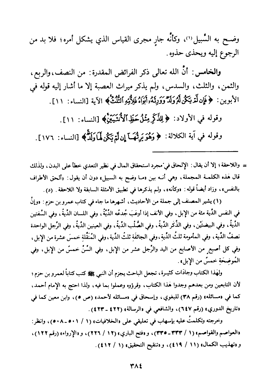1 يشير المصنف إلى جملة من الأحاديث، أشهرها ما جاء في كتاب عمرو بن حزم: "وإن في النفس الدية مائة من الإبل، وفي الأنف إذا أوعب جدعه الدية، وفي اللسان الدية، وفي الشفتين الدية، وفي البيضتين، وفي الذكر الدية، وفي الصلب الدية، وفي العينين الدية، وفي الرجل الواحدة نصف الدية، وفي المأمومة ثلث الدية، وفي الجائفة ثلث الدية، وفي المنقلة خمس عشرة من الإبل، وفي كل أصبع من الأصابع من اليد والرجل عشرة من الإبل، وفي السن خمس من الإبل، وفي الموضحة خمس من الإبل".