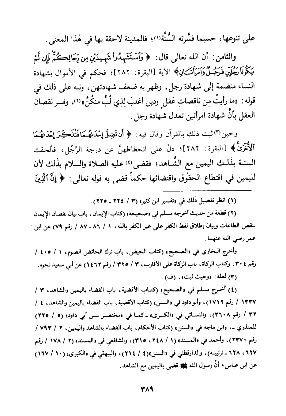وَحِينَ3 ثَبَتَ ذَلِكَ بِالْقُرْآنِ وَقَالَ فِيهِ: {أَنْ تَضِلَّ إِحْدَاهُمَا فَتُذَكِّرَ إِحْدَاهُمَا الْأُخْرَى} [الْبَقَرَةِ: 282] ؛ دَلَّ عَلَى انْحِطَاطِهِنَّ عَنْ دَرَجَةِ الرَّجُلِ، فَأَلْحَقَتِ السُّنَّةُ بِذَلِكَ الْيَمِينَ مَعَ الشَّاهِدِ؛ فَقَضَى4 عَلَيْهِ الصَّلَاةُ وَالسَّلَامُ بِذَلِكَ لِأَنَّ لِلْيَمِينِ فِي اقْتِطَاعِ الْحُقُوقِ وَاقْتِضَائِهَا حُكْمًا قَضَى بِهِ قَوْلُهُ تعالى: {إِنَّ الَّذِينَ