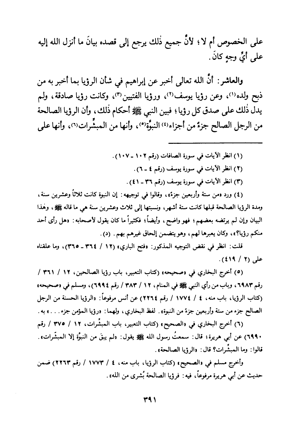 وَالْعَاشِرُ: أَنَّ اللَّهَ تَعَالَى أَخْبَرَ عَنْ إِبْرَاهِيمَ فِي شَأْنِ الرُّؤْيَا بِمَا أَخْبَرَ بِهِ مِنْ ذَبْحِ وَلَدِهِ1، وَعَنْ رُؤْيَا يُوسُفَ2، وَرُؤْيَا الْفَتَيَيْنِ3، وَكَانَتْ رُؤْيَا صَادِقَةً، وَلَمْ يَدُلَّ ذَلِكَ عَلَى صِدْقِ كُلِّ رُؤْيَا؛ فَبَيَّنَ النَّبِيُّ -صَلَّى اللَّهُ عَلَيْهِ وَسَلَّمَ- أَحْكَامَ ذَلِكَ، وَأَنَّ الرُّؤْيَا الصَّالِحَةَ مِنَ الرَّجُلِ الصَّالِحِ جُزْءٌ مِنْ أَجْزَاءِ4 النُّبُوَّةِ5، وَأَنَّهَا مِنَ المبشرات6، وأنها على