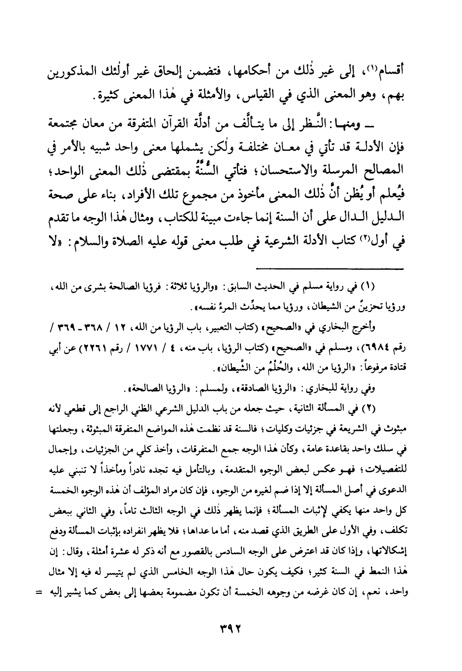 - وَمِنْهَا: النَّظَرُ إِلَى مَا يَتَأَلَّفُ مِنْ أَدِلَّةِ الْقُرْآنِ الْمُتَفَرِّقَةِ مِنْ مَعَانٍ مُجْتَمِعَةٍ فَإِنَّ الْأَدِلَّةَ قَدْ تَأْتِي فِي مَعَانٍ مُخْتَلِفَةٍ وَلَكِنْ يَشْمَلُهَا مَعْنًى وَاحِدٌ شَبِيهٌ بِالْأَمْرِ فِي الْمَصَالِحِ الْمُرْسَلَةِ وَالِاسْتِحْسَانِ؛ فَتَأْتِي السُّنَّةُ بِمُقْتَضَى ذَلِكَ الْمَعْنَى الْوَاحِدِ؛ فَيُعْلَمُ أَوْ يُظَنُّ أَنَّ ذَلِكَ الْمَعْنَى مَأْخُوذٌ مِنْ مَجْمُوعِ تِلْكَ الْأَفْرَادِ، بِنَاءً عَلَى صِحَّةِ الدَّلِيلِ الدَّالِّ عَلَى أَنَّ السُّنَّةَ إِنَّمَا جَاءَتْ مُبَيِّنَةً لِلْكِتَابِ، وَمِثَالُ هَذَا الْوَجْهِ مَا تَقَدَّمَ فِي أَوَّلِ2 كِتَابِ الْأَدِلَّةِ الشَّرْعِيَّةِ فِي طَلَبِ مَعْنَى قَوْلِهِ, عَلَيْهِ الصَّلَاةُ وَالسَّلَامُ: "لَا