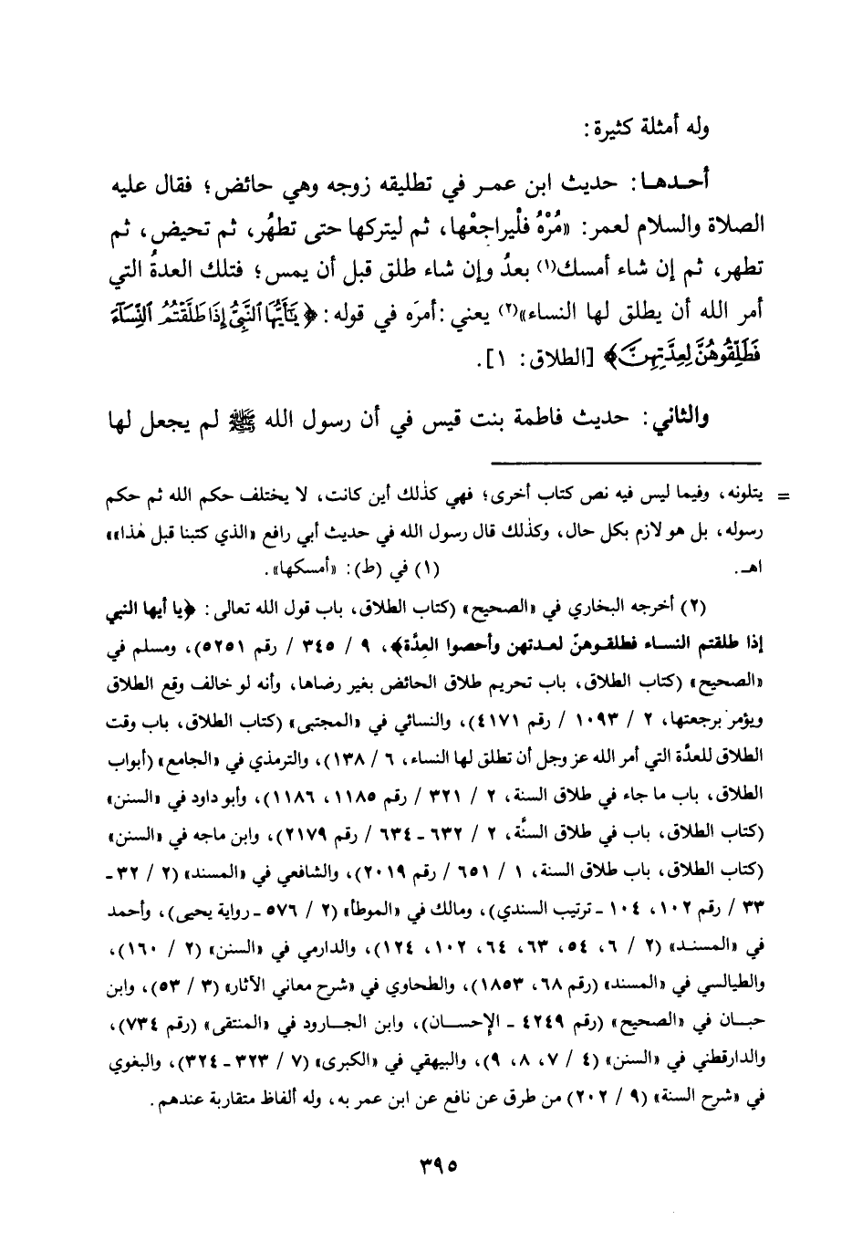 2 أخرجه البخاري في "الصحيح" "كتاب الطلاق، باب قول الله تعالى: {يَا أَيُّهَا النَّبِيُّ إِذَا طَلَّقْتُمُ النِّسَاءَ فَطَلِّقُوهُنَّ لِعِدَّتِهِنَّ وَأَحْصُوا الْعِدَّةَ} ، 9/ 345/ رقم 5251"، ومسلم في "الصحيح" "كتاب الطلاق، باب تحريم طلاق الحائض بغير رضاها، وأنه لو خالف وقع الطلاق ويؤمر برجعتها، 2/ 1093/ رقم 4171"، والنسائي في "المجتبى" "كتاب الطلاق، باب وقت الطلاق للعدة التي أمر الله -عز وجل- أن تطلق لها النساء، 6/ 138"، والترمذي في "الجامع" "أبواب الطلاق، باب ما جاء في طلاق السنة، 2/ 321/ رقم 1185، 1186"، وأبو داود في "السنن" "كتاب الطلاق، باب في طلاق السنة، 2/ 632-634/ رقم 2179"، وابن ماجه في "السنن" "كتاب الطلاق، باب طلاق السنة، 1/ 651/ رقم 2019"، والشافعي في "المسند" "2/ 32-33/ رقم 102-104, ترتيب السندي"، ومالك في "الموطأ" "2/ 576, رواية يحيى"، وأحمد في "المسند" "2/ 6، 54، 63، 64، 102، 124"، والدارمي في "السنن" "2/ 160"، والطيالسي في "المسند" "رقم 68، 1853"، والطحاوي في "شرح معاني الآثار" "3/ 53"، وابن حبان في "الصحيح" "رقم 4249, الإحسان"، وابن الجارود في "المنتقى" "رقم 734"، والدارقطني في "السنن" "4/ 7، 8، 9"، والبيهقي في "الكبرى" "7/ 323-324"، والبغوي في "شرح السنة" "9/ 202" من طرق عن نافع عن ابن عمر به، وله ألفاظ متقاربة عندهم.