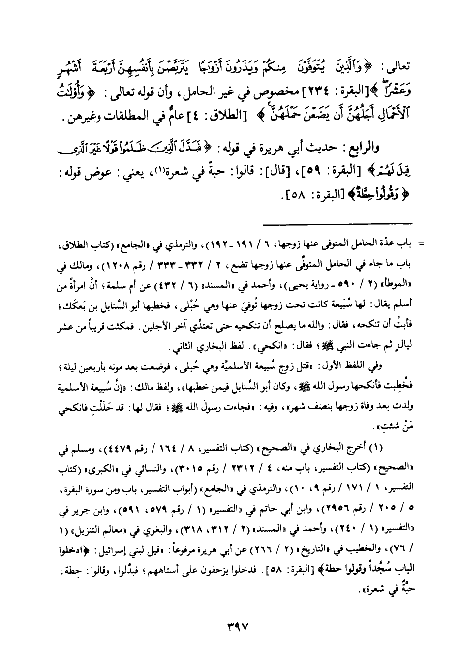 = باب عدة الحامل المتوفى عنها زوجها، 6/ 191-192"، والترمذي في "الجامع" "كتاب الطلاق، باب ما جاء في الحامل المتوفى عنها زوجها تضع، 2/ 332-333/ رقم 1208"، ومالك في "الموطأ" "2/ 590, رواية يحيى"، وأحمد في "المسند" "6/ 432" عن أم سلمة؛ أن امرأة من أسلم يقال لها: سبيعة كانت تحت زوجها توفي عنها وهي حبلى، فخطبها أبو السنابل بن بعكك، فأبت أن تنكحه، فقال: والله ما يصلح أن تنكحيه حتى تعتدي آخر الأجلين, فمكثت قريبًا من عشر ليال ثم جاءت النبي -صلى الله عليه وسلم- فقال: "انكحي". لفظ البخاري الثاني.